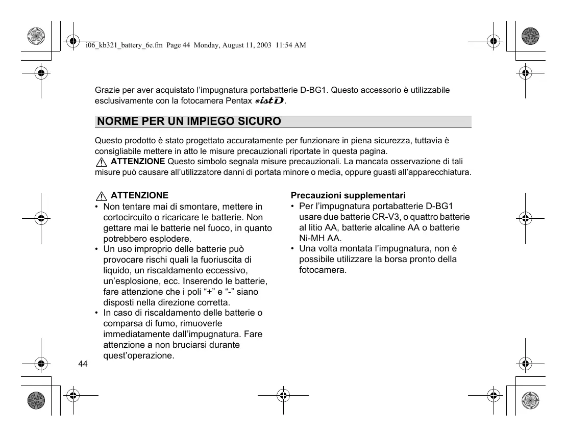 i06_kb321_battery_6e.fm Page 44 Monday, August 11, 2003 11:54 AM Grazie per aver acquistato l’impugnatura portabatterie D-BG1. Questo accessorio è utilizzabile esclusivamente con la fotocamera Pentax w.