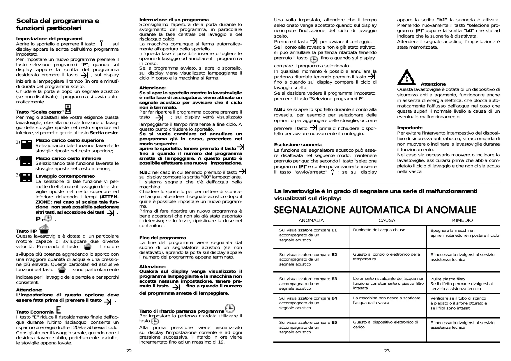ANOMALIA CAUSA RIMEDIO Sul visualizzatore compare E1 accompagnato da un segnale acustico Rubinetto dell’acqua chiuso Spegnere la macchina , aprire il rubinetto reimpostare il ciclo Sul visualizzatore compare E2 accompagnato da un segnale acustico Guasto al controllo elettronico della temperatura E’ necessario rivolgersi al servizio assistenza tecnica Sul visualizzatore compare E3 accompagnato da un segnale acustico L’elemento riscaldante dell’acqua non funziona correttamente o piastra filtro intasata Pulire piastra filtro. Se il difetto permane rivolgersi al servizio assistenza tecnica Sul visualizzatore compare E4 accompagnato da un segnale acustico La macchina non riesce a scaricare l’acqua dalla vasca Verificare se il tubo di scarico è piegato o il sifone otturato e se i filtri sono intasati Sul visualizzatore compare E5 accompagnato da un segnale acustico Guasto al dispositivo elettronico di carico E’ necessario rivolgersi al servizio assistenza tecnica