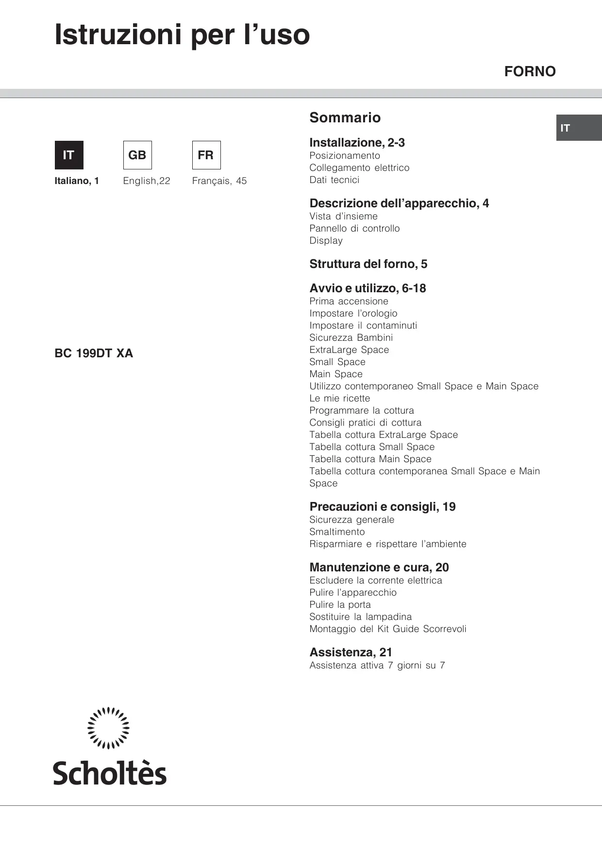 Français, 45 Installazione, 2-3 Posizionamento Collegamento elettrico Dati tecnici Descrizione dell’apparecchio, 4 Vista d’insieme Pannello di controllo Display Struttura del forno, 5 Avvio e utilizzo, 6-18 BC 199DT XA Prima accensione Impostare l’orologio Impostare il contaminuti Sicurezza Bambini ExtraLarge Space Small Space Main Space Utilizzo contemporaneo Small Space e Main Space Le mie ricette Programmare la cottura Consigli pratici di cottura Tabella cottura ExtraLarge Space Tabella cottura Small Space Tabella cottura Main Space Tabella cottura contemporanea Small Space e Main Space Precauzioni e consigli, 19 Sicurezza generale Smaltimento Risparmiare e rispettare l’ambiente Manutenzione e cura, 20 Escludere la corrente elettrica Pulire l’apparecchio Pulire la porta Sostituire la lampadina Montaggio del Kit Guide Scorrevoli Assistenza, 21 Assistenza attiva 7 giorni su 7