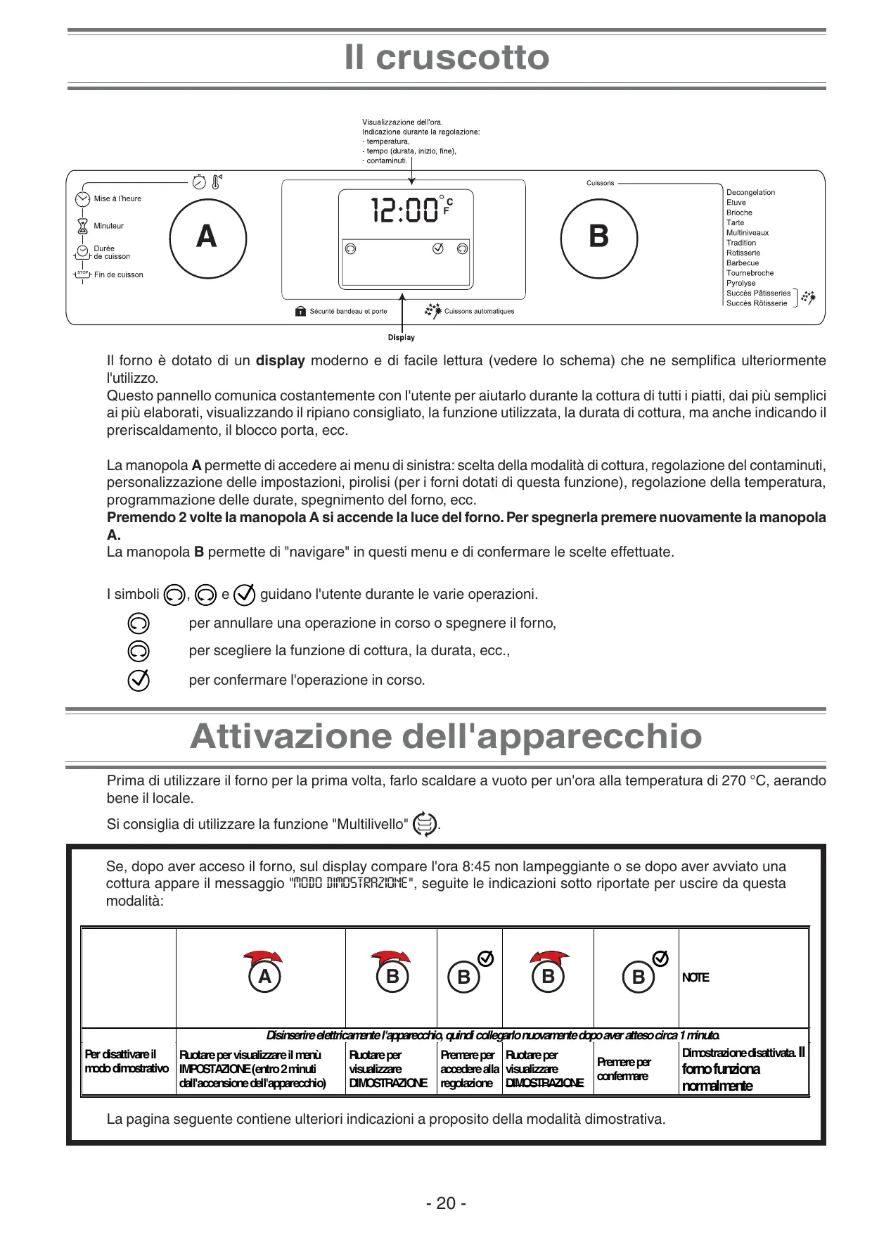 Il cruscotto Il forno è dotato di un display moderno e di facile lettura (vedere lo schema) che ne semplifica ulteriormente l'utilizzo. Questo pannello comunica costantemente con l'utente per aiutarlo durante la cottura di tutti i piatti, dai più semplici ai più elaborati, visualizzando il ripiano consigliato, la funzione utilizzata, la durata di cottura, ma anche indicando il preriscaldamento, il blocco porta, ecc. La manopola A permette di accedere ai menu di sinistra: scelta della modalità di cottura, regolazione del contaminuti, personalizzazione delle impostazioni, pirolisi (per i forni dotati di questa funzione), regolazione della temperatura, programmazione delle durate, spegnimento del forno, ecc. Premendo 2 volte la manopola A si accende la luce del forno. Per spegnerla premere nuovamente la manopola La manopola B permette di "navigare" in questi menu e di confermare le scelte effettuate. I simboli