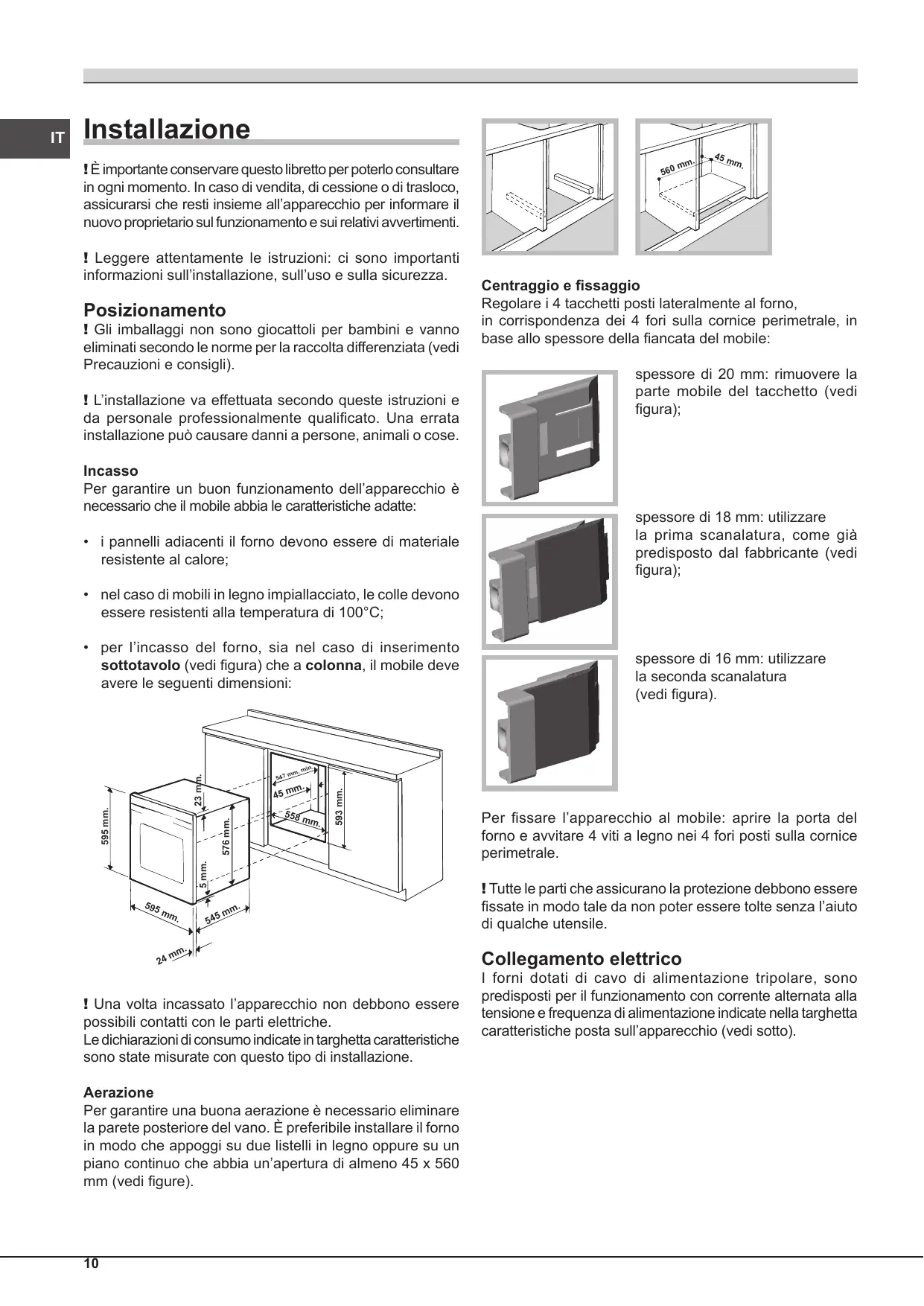 ! Una volta incassato l’apparecchio non debbono essere possibili contatti con le parti elettriche. Le dichiarazioni di consumo indicate in targhetta caratteristiche sono state misurate con questo tipo di installazione. Aerazione Per garantire una buona aerazione è necessario eliminare la parete posteriore del vano. È preferibile installare il forno in modo che appoggi su due listelli in legno oppure su un piano continuo che abbia un’apertura di almeno 45 x 560 mm (vedi figure).