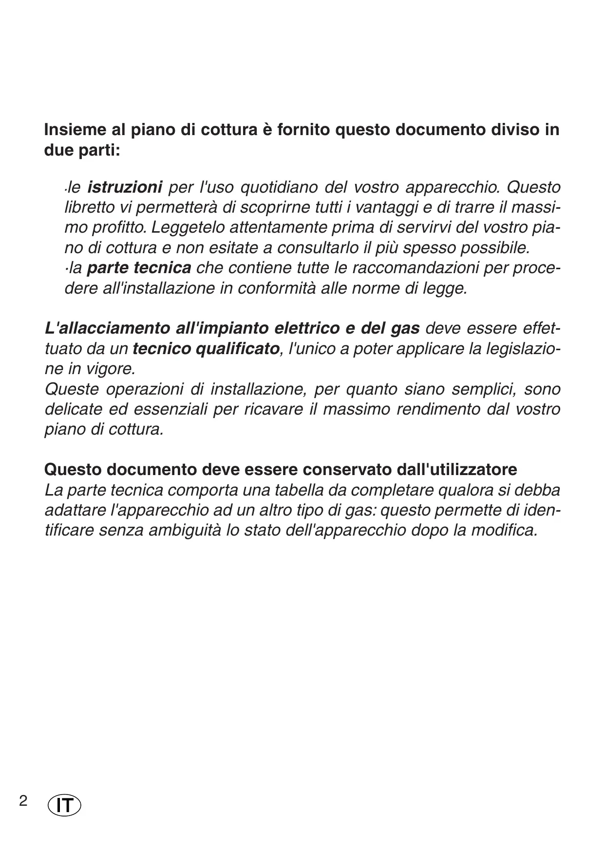 - la parte tecnica che contiene tutte le raccomandazioni per procedere all'installazione in conformità alle norme di legge. L'allacciamento all'impianto elettrico e del gas deve essere effettuato da un tecnico qualificato, l'unico a poter applicare la legislazione in vigore. Queste operazioni di installazione, per quanto siano semplici, sono delicate ed essenziali per ricavare il massimo rendimento dal vostro piano di cottura. Questo documento deve essere conservato dall'utilizzatore La parte tecnica comporta una tabella da completare qualora si debba adattare l'apparecchio ad un altro tipo di gas: questo permette di identificare senza ambiguità lo stato dell'apparecchio dopo la modifica.