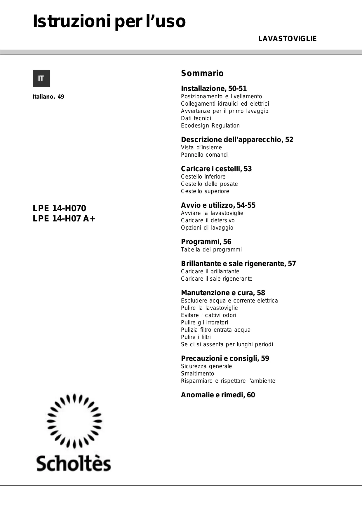 LPE 14-H070 IX - Lavastoviglie SCHOLTES - Manuale utente e istruzioni gratuiti