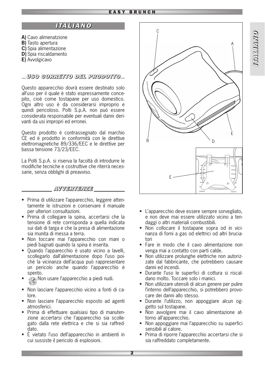Questo apparecchio dovrà essere destinato solo all’uso per il quale è stato espressamente concepito, cioè come tostapane per uso domestico. Ogni altro uso è da considerarsi improprio e quindi pericoloso. Polti S.p.A. non può essere considerata responsabile per eventuali danni derivanti da usi impropri ed erronei. Questo prodotto è contrassegnato dal marchio CE ed è prodotto in conformità con le direttive elettromagnetiche 89/336/EEC e le direttive per bassa tensione 73/23/EEC.