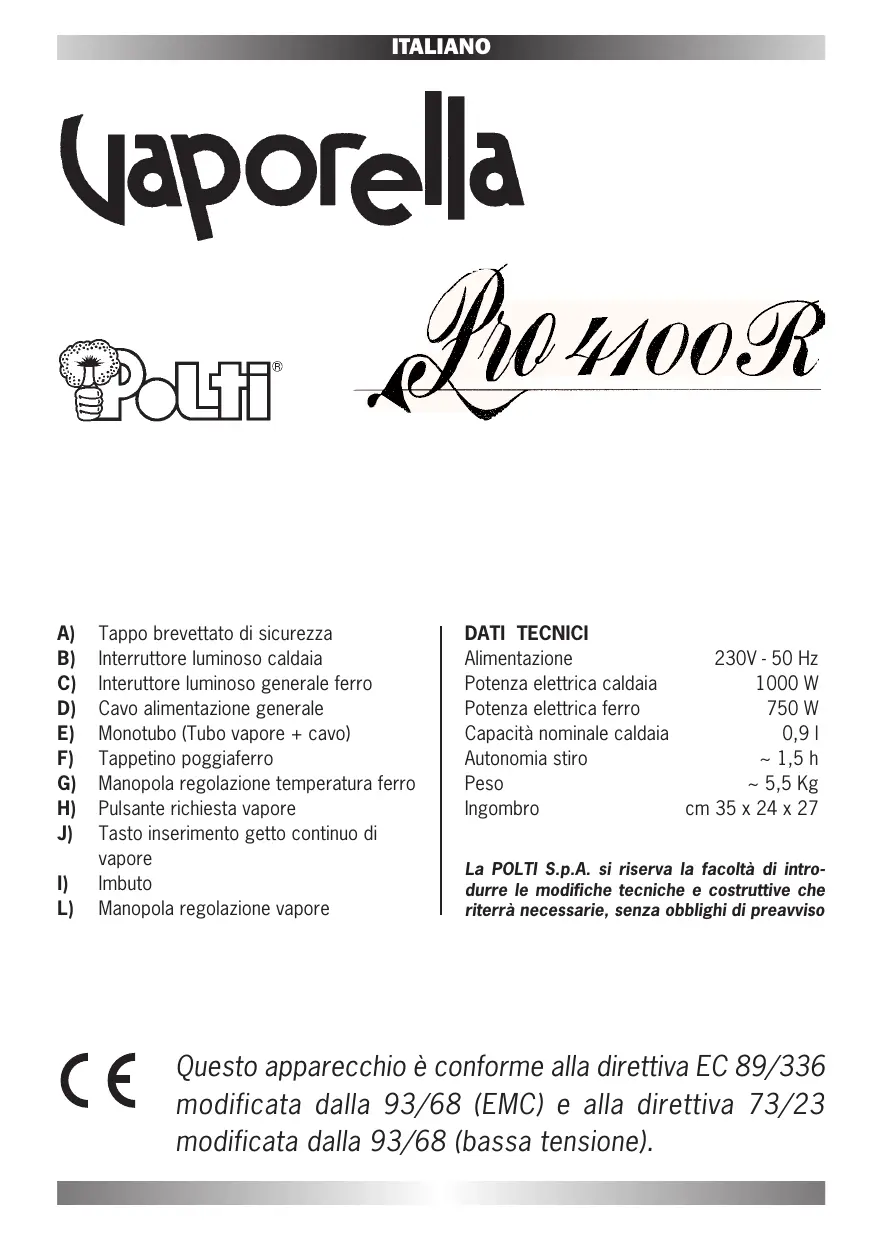 - J) Monotubo (Tubo vapore + cavo) Capacità nominale caldaia 0,9 l Tappetino poggiaferro Autonomia stiro ~ 1,5 h IlManopola flusso di vaporetemperatura è regolabile a 50 gr/min. durante l’utilizzo. regolazione ferro da 0 Peso ~ 5,5 Kg Pulsante richiesta vapore Ingombro cm 35 x 24 x 27 valvola di sicurezza, Tasto inserimento getto continuo ildi termostato di sicurezza e il termostato vapore La il POLTI S.p.A. si riserva a la secco facoltà dimanintrosupplementare di protezione contro funzionamento Imbuto durre le modifiche tecniche e costruttive che costantemente VAPORELLA più assolute condizioni L) tengono Manopola regolazione vapore riterrànelle necessarie, senza obblighi di preavviso di sicurezza. Questo apparecchio è conforme alla direttiva EC 89/336 modificata dalla 93/68 (EMC) e alla direttiva 73/23 modificata dalla 93/68 (bassa tensione). ITALIANO