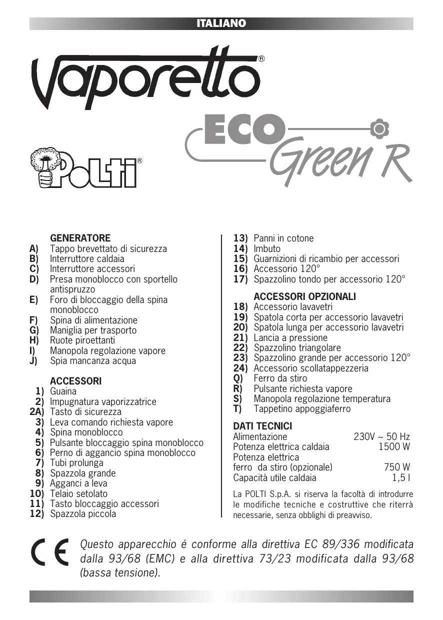 ITALIANO Gentile Cliente, vogliamo ringraziarLa per la fiducia accordata a POLTI acquistando questo prodotto e quindi di aver contribuito alla salvaguardia del bene più prezioso che ci circonda: LA NATURA! VAPORETTO ECO GREEN R risolve infatti tutti i problemi di pulizia e di igiene senza l’uso di detergenti tossici e dannosi per l’ambiente: la normale acqua del rubinetto viene trasformata in vapore con una pressione potente e costante. Sfruttando questa energia VAPORETTO è in grado di pulire più a fondo e in modo ecologico. La nostra équipe di tecnici, progettandolo, l’ha dotato di strumenti atti a rendere il Suo lavoro sempre più efficiente e sicuro: