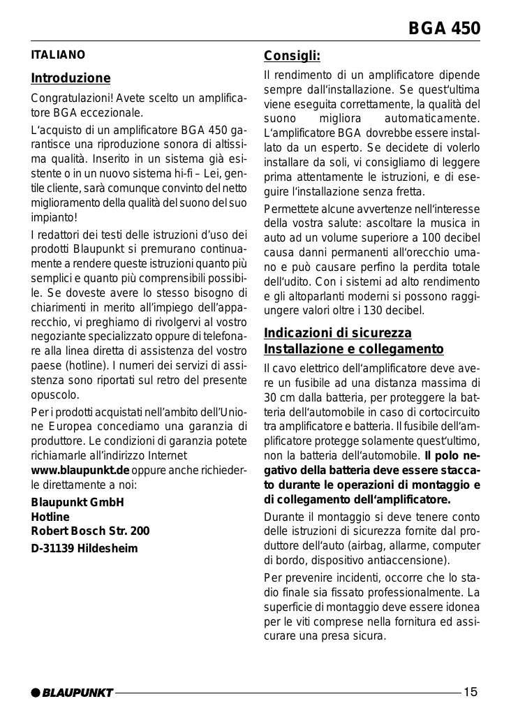 Congratulazioni! Avete scelto un amplificatore BGA eccezionale. L‘acquisto di un amplificatore BGA 450 garantisce una riproduzione sonora di altissima qualità. Inserito in un sistema già esistente o in un nuovo sistema hi-fi – Lei, gentile cliente, sarà comunque convinto del netto miglioramento della qualità del suono del suo impianto! I redattori dei testi delle istruzioni d’uso dei prodotti Blaupunkt si premurano continuamente a rendere queste istruzioni quanto più semplici e quanto più comprensibili possibile. Se doveste avere lo stesso bisogno di chiarimenti in merito all’impiego dell’apparecchio, vi preghiamo di rivolgervi al vostro negoziante specializzato oppure di telefonare alla linea diretta di assistenza del vostro paese (hotline). I numeri dei servizi di assistenza sono riportati sul retro del presente opuscolo. Per i prodotti acquistati nell’ambito dell’Unione Europea concediamo una garanzia di produttore. Le condizioni di garanzia potete richiamarle all’indirizzo Internet www.blaupunkt.de oppure anche richiederle direttamente a noi: Blaupunkt GmbH Hotline Robert Bosch Str. 200 D-31139 Hildesheim