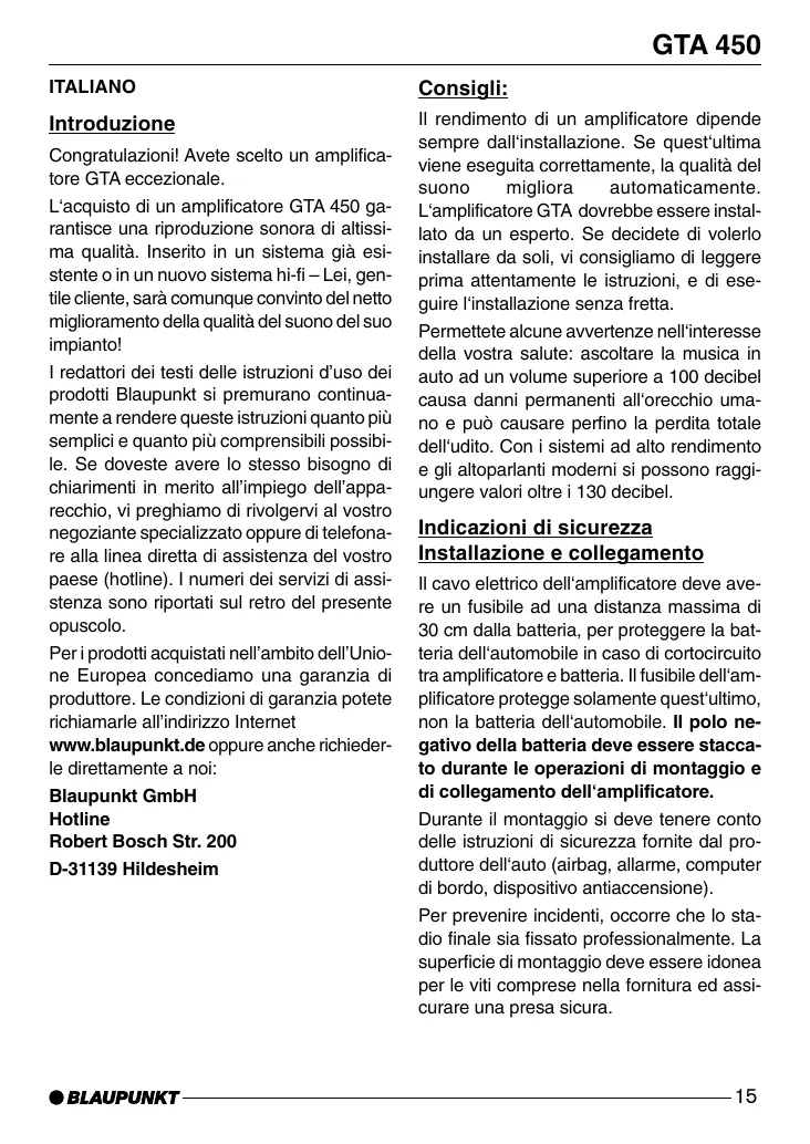 Congratulazioni! Avete scelto un amplificatore GTA eccezionale. L‘acquisto di un amplificatore GTA 450 garantisce una riproduzione sonora di altissima qualità. Inserito in un sistema già esistente o in un nuovo sistema hi-fi – Lei, gentile cliente, sarà comunque convinto del netto miglioramento della qualità del suono del suo impianto! I redattori dei testi delle istruzioni d’uso dei prodotti Blaupunkt si premurano continuamente a rendere queste istruzioni quanto più semplici e quanto più comprensibili possibile. Se doveste avere lo stesso bisogno di chiarimenti in merito all’impiego dell’apparecchio, vi preghiamo di rivolgervi al vostro negoziante specializzato oppure di telefonare alla linea diretta di assistenza del vostro paese (hotline). I numeri dei servizi di assistenza sono riportati sul retro del presente opuscolo. Per i prodotti acquistati nell’ambito dell’Unione Europea concediamo una garanzia di produttore. Le condizioni di garanzia potete richiamarle all’indirizzo Internet www.blaupunkt.de oppure anche richiederle direttamente a noi: Blaupunkt GmbH Hotline Robert Bosch Str. 200 D-31139 Hildesheim