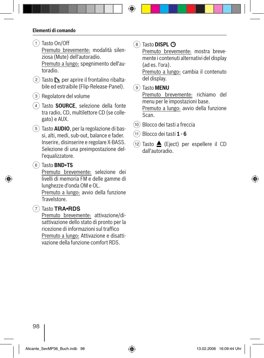 1 Tasto On/Off Premuto brevemente: modalità silenziosa (Mute) dell'autoradio. Premuto a lungo: spegnimento dell'autoradio. 2 Tasto per aprire il frontalino ribaltabile ed estraibile (Flip-Release-Panel). 3 Regolatore del volume 4 Tasto SOURCE, selezione della fonte tra radio, CD, multilettore CD (se collegato) e AUX. 5 Tasto AUDIO, per la regolazione di bassi, alti, medi, sub-out, balance e fader. Inserire, disinserire e regolare X-BASS. Selezione di una preimpostazione dell'equalizzatore.