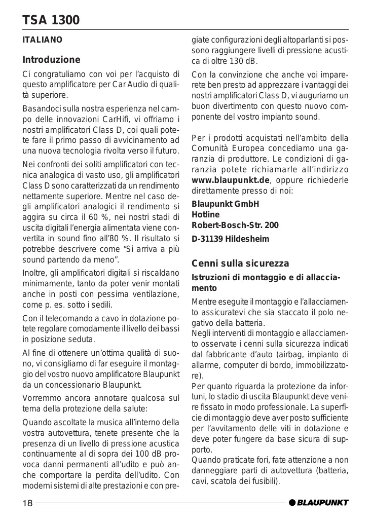 Scarica le istruzioni per il tuo Cassa acustica in formato PDF gratuitamente! Trova il tuo manuale TSA 1300 - BLAUPUNKT e riprendi in mano il tuo dispositivo elettronico. In questa pagina sono pubblicati tutti i documenti necessari per l'utilizzo del tuo dispositivo. TSA 1300 del marchio BLAUPUNKT.