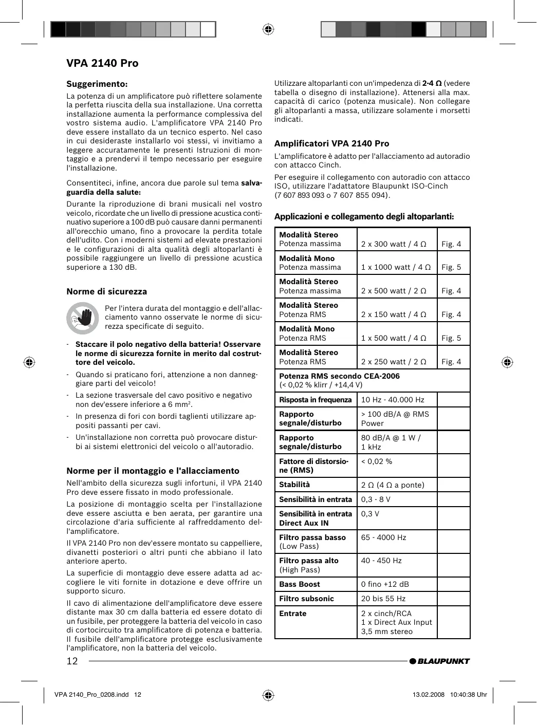 VELOCITY VPA 2140 PRO - Amplificatore audio BLAUPUNKT - Manuale utente e istruzioni gratuiti