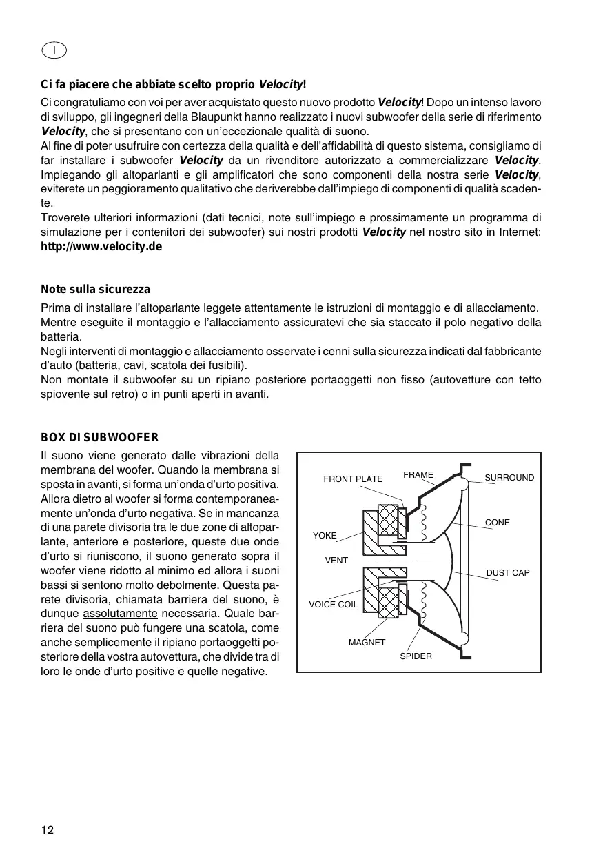 I Ci fa piacere che abbiate scelto proprio Velocity! Ci congratuliamo con voi per aver acquistato questo nuovo prodotto Velocity! Dopo un intenso lavoro di sviluppo, gli ingegneri della Blaupunkt hanno realizzato i nuovi subwoofer della serie di riferimento Velocity, che si presentano con un’eccezionale qualità di suono. Al fine di poter usufruire con certezza della qualità e dell’affidabilità di questo sistema, consigliamo di far installare i subwoofer Velocity da un rivenditore autorizzato a commercializzare Velocity. Impiegando gli altoparlanti e gli amplificatori che sono componenti della nostra serie Velocity, eviterete un peggioramento qualitativo che deriverebbe dall’impiego di componenti di qualità scadente. Troverete ulteriori informazioni (dati tecnici, note sull’impiego e prossimamente un programma di simulazione per i contenitori dei subwoofer) sui nostri prodotti Velocity nel nostro sito in Internet: http://www.velocity.de