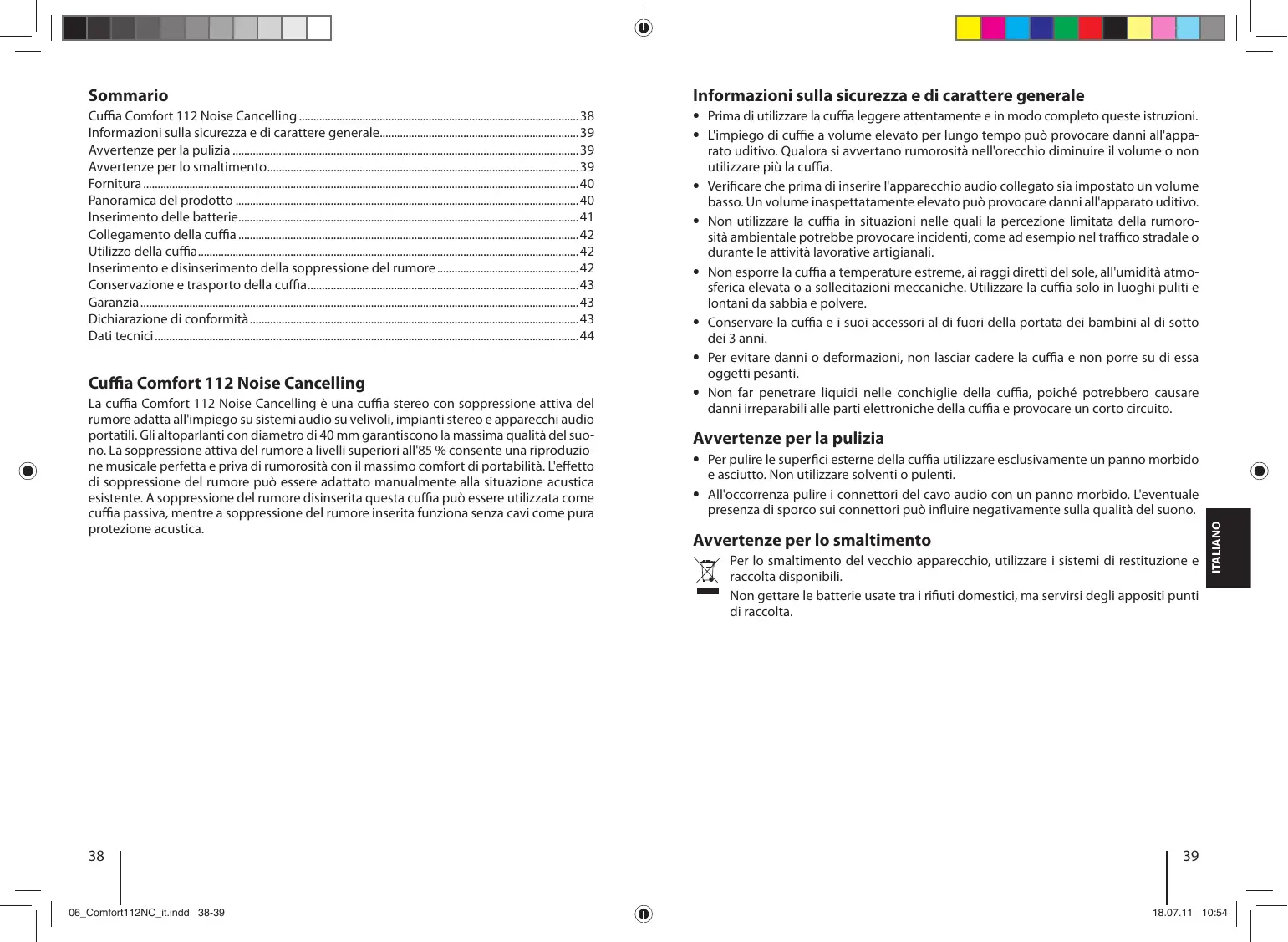 Cuffia Comfort 112 Noise Cancelling 38 Informazioni sulla sicurezza e di carattere generale 39 Avvertenze per la pulizia 39 Avvertenze per lo smaltimento 39 Fornitura 40 Panoramica del prodotto 40 Inserimento delle batterie 41 Collegamento della cuffia 42 Utilizzo della cuffia 42 Inserimento e disinserimento della soppressione del rumore 42 Conservazione e trasporto della cuffia 43 Garanzia 43 Dichiarazione di conformità 43 Dati tecnici 44