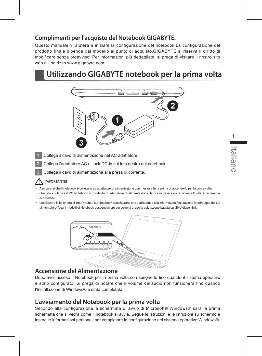 Complimenti per l'acquisto del Notebook GIGABYTE. Questo manuale vi aiuterà a iniziare la configurazione del notebook.La configurazione del prodotto finale dipende dal modello al punto di acquisto.GIGABYTE si riserva il diritto di modificare senza preavviso. Per informazioni più dettagliate, si prega di visitare il nostro sito web all'indirizzo www.gigabyte.com.