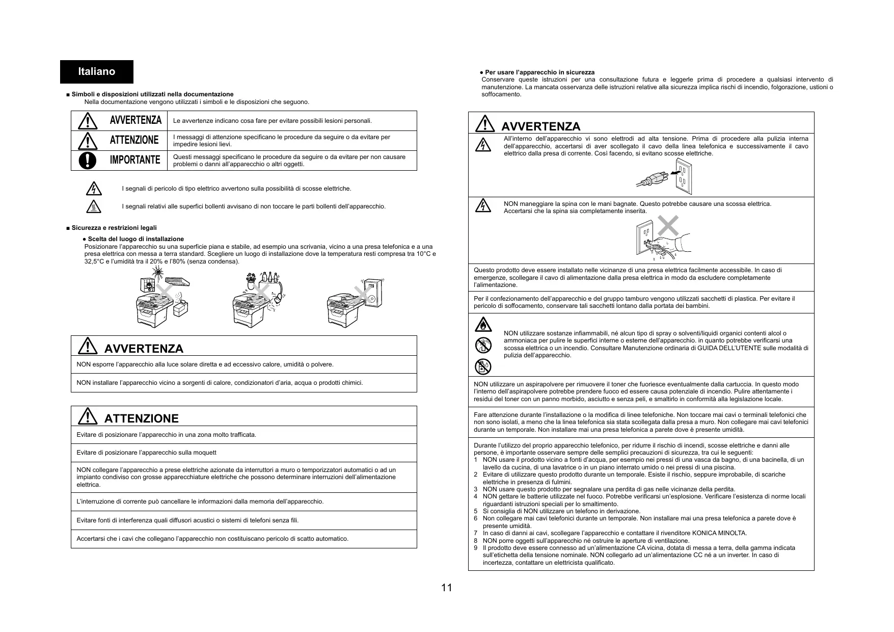 Italiano ● Per usare l’apparecchio in sicurezza Conservare queste istruzioni per una consultazione futura e leggerle prima di procedere a qualsiasi intervento di manutenzione. La mancata osservanza delle istruzioni relative alla sicurezza implica rischi di incendio, folgorazione, ustioni o soffocamento. ■ Simboli e disposizioni utilizzati nella documentazione Nella documentazione vengono utilizzati i simboli e le disposizioni che seguono. AVVERTENZA Le avvertenze indicano cosa fare per evitare possibili lesioni personali. ATTENZIONE I messaggi di attenzione specificano le procedure da seguire o da evitare per impedire lesioni lievi. IMPORTANTE Questi messaggi specificano le procedure da seguire o da evitare per non causare problemi o danni all’apparecchio o altri oggetti. AVVERTENZA All’interno dell’apparecchio vi sono elettrodi ad alta tensione. Prima di procedere alla pulizia interna dell’apparecchio, accertarsi di aver scollegato il cavo della linea telefonica e successivamente il cavo elettrico dalla presa di corrente. Così facendo, si evitano scosse elettriche. I segnali di pericolo di tipo elettrico avvertono sulla possibilità di scosse elettriche. NON maneggiare la spina con le mani bagnate. Questo potrebbe causare una scossa elettrica. Accertarsi che la spina sia completamente inserita. I segnali relativi alle superfici bollenti avvisano di non toccare le parti bollenti dell’apparecchio. ■ Sicurezza e restrizioni legali ● Scelta del luogo di installazione Posizionare l’apparecchio su una superficie piana e stabile, ad esempio una scrivania, vicino a una presa telefonica e a una presa elettrica con messa a terra standard. Scegliere un luogo di installazione dove la temperatura resti compresa tra 10°C e 32,5°C e l’umidità tra il 20% e l’80% (senza condensa). Questo prodotto deve essere installato nelle vicinanze di una presa elettrica facilmente accessibile. In caso di emergenze, scollegare il cavo di alimentazione dalla presa elettrica in modo da escludere completamente l’alimentazione. Per il confezionamento dell’apparecchio e del gruppo tamburo vengono utilizzati sacchetti di plastica. Per evitare il pericolo di soffocamento, conservare tali sacchetti lontano dalla portata dei bambini. NON utilizzare sostanze infiammabili, né alcun tipo di spray o solventi/liquidi organici contenti alcol o ammoniaca per pulire le superfici interne o esterne dell’apparecchio. in quanto potrebbe verificarsi una scossa elettrica o un incendio. Consultare Manutenzione ordinaria di GUIDA DELL’UTENTE sulle modalità di pulizia dell’apparecchio. AVVERTENZA NON esporre l’apparecchio alla luce solare diretta e ad eccessivo calore, umidità o polvere. NON installare l’apparecchio vicino a sorgenti di calore, condizionatori d’aria, acqua o prodotti chimici. NON utilizzare un aspirapolvere per rimuovere il toner che fuoriesce eventualmente dalla cartuccia. In questo modo l’interno dell’aspirapolvere potrebbe prendere fuoco ed essere causa potenziale di incendio. Pulire attentamente i residui del toner con un panno morbido, asciutto e senza peli, e smaltirlo in conformità alla legislazione locale. Fare attenzione durante l’installazione o la modifica di linee telefoniche. Non toccare mai cavi o terminali telefonici che non sono isolati, a meno che la linea telefonica sia stata scollegata dalla presa a muro. Non collegare mai cavi telefonici durante un temporale. Non installare mai una presa telefonica a parete dove è presente umidità. ATTENZIONE Evitare di posizionare l’apparecchio in una zona molto trafficata. Durante l’utilizzo del proprio apparecchio telefonico, per ridurre il rischio di incendi, scosse elettriche e danni alle persone, è importante osservare sempre delle semplici precauzioni di sicurezza, tra cui le seguenti: 1 NON usare il prodotto vicino a fonti d’acqua, per esempio nei pressi di una vasca da bagno, di una bacinella, di un lavello da cucina, di una lavatrice o in un piano interrato umido o nei pressi di una piscina. 2 Evitare di utilizzare questo prodotto durante un temporale. Esiste il rischio, seppure improbabile, di scariche elettriche in presenza di fulmini. 3 NON usare questo prodotto per segnalare una perdita di gas nelle vicinanze della perdita. 4 NON gettare le batterie utilizzate nel fuoco. Potrebbe verificarsi un’esplosione. Verificare l’esistenza di norme locali riguardanti istruzioni speciali per lo smaltimento. 5 Si consiglia di NON utilizzare un telefono in derivazione. 6 Non collegare mai cavi telefonici durante un temporale. Non installare mai una presa telefonica a parete dove è presente umidità. 7 In caso di danni ai cavi, scollegare l’apparecchio e contattare il rivenditore KONICA MINOLTA. 8 NON porre oggetti sull’apparecchio né ostruire le aperture di ventilazione. 9 Il prodotto deve essere connesso ad un’alimentazione CA vicina, dotata di messa a terra, della gamma indicata sull’etichetta della tensione nominale. NON collegarlo ad un’alimentazione CC né a un inverter. In caso di incertezza, contattare un elettricista qualificato. Evitare di posizionare l’apparecchio sulla moquett NON collegare l’apparecchio a prese elettriche azionate da interruttori a muro o temporizzatori automatici o ad un impianto condiviso con grosse apparecchiature elettriche che possono determinare interruzioni dell’alimentazione elettrica. L’interruzione di corrente può cancellare le informazioni dalla memoria dell’apparecchio. Evitare fonti di interferenza quali diffusori acustici o sistemi di telefoni senza fili. Accertarsi che i cavi che collegano l’apparecchio non costituiscano pericolo di scatto automatico.