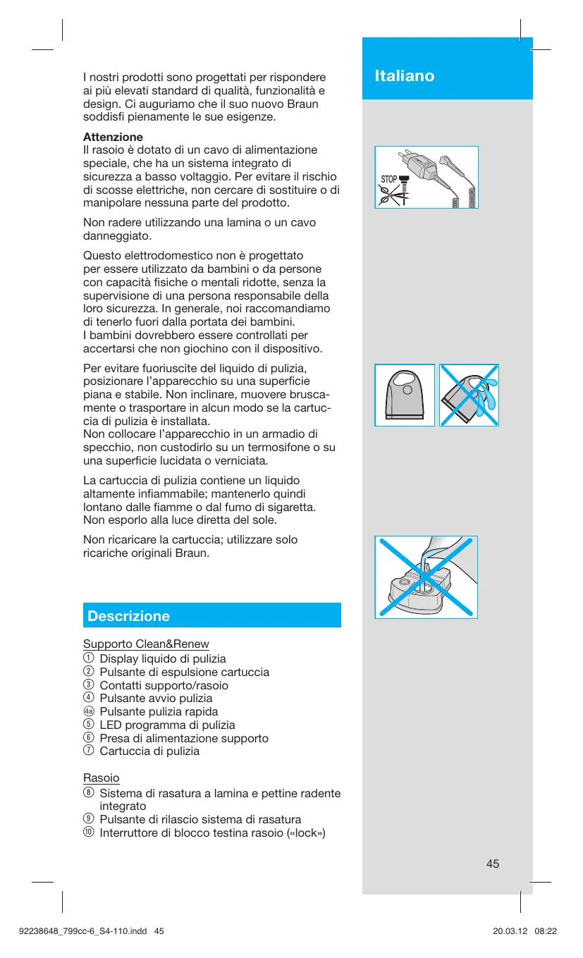 I nostri prodotti sono progettati per rispondere ai più elevati standard di qualità, funzionalità e design. Ci auguriamo che il suo nuovo Braun soddisfi pienamente le sue esigenze. Attenzione Il rasoio è dotato di un cavo di alimentazione speciale, che ha un sistema integrato di sicurezza a basso voltaggio. Per evitare il rischio di scosse elettriche, non cercare di sostituire o di manipolare nessuna parte del prodotto. Italiano STOP Non radere utilizzando una lamina o un cavo danneggiato. Questo elettrodomestico non è progettato per essere utilizzato da bambini o da persone con capacità fisiche o mentali ridotte, senza la supervisione di una persona responsabile della loro sicurezza. In generale, noi raccomandiamo di tenerlo fuori dalla portata dei bambini. I bambini dovrebbero essere controllati per accertarsi che non giochino con il dispositivo. Per evitare fuoriuscite del liquido di pulizia, posizionare l’apparecchio su una superficie piana e stabile. Non inclinare, muovere bruscamente o trasportare in alcun modo se la cartuccia di pulizia è installata. Non collocare l’apparecchio in un armadio di specchio, non custodirlo su un termosifone o su una superficie lucidata o verniciata. La cartuccia di pulizia contiene un liquido altamente infiammabile; mantenerlo quindi lontano dalle fiamme o dal fumo di sigaretta. Non esporlo alla luce diretta del sole. Non ricaricare la cartuccia; utilizzare solo ricariche originali Braun. Descrizione Supporto Clean&Renew 1 Display liquido di pulizia 2 Pulsante di espulsione cartuccia 3 Contatti supporto/rasoio 4 Pulsante avvio pulizia D Pulsante pulizia rapida 5 LED programma di pulizia 6 Presa di alimentazione supporto 7 Cartuccia di pulizia Rasoio Sistema di rasatura a lamina e pettine radente integrato 9 Pulsante di rilascio sistema di rasatura 0 Interruttore di blocco testina rasoio («lock»)