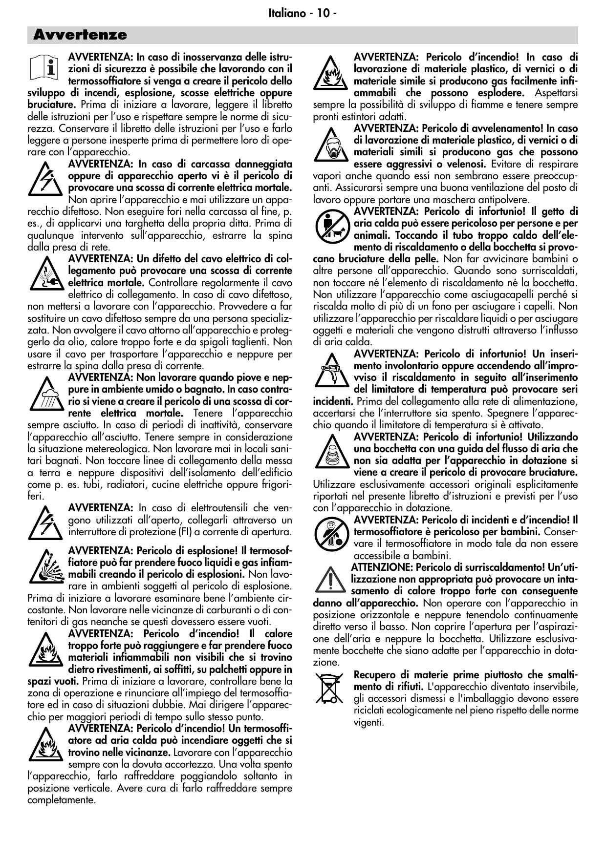 AVVERTENZA: Pericolo d’incendio! In caso di lavorazione di materiale plastico, di vernici o di materiale simile si producono gas facilmente infiammabili che possono esplodere. Aspettarsi sempre la possibilità di sviluppo di fiamme e tenere sempre pronti estintori adatti. AVVERTENZA: Pericolo di avvelenamento! In caso di lavorazione di materiale plastico, di vernici o di materiali simili si producono gas che possono essere aggressivi o velenosi. Evitare di respirare vapori anche quando essi non sembrano essere preoccupanti. Assicurarsi sempre una buona ventilazione del posto di lavoro oppure portare una maschera antipolvere. AVVERTENZA: Pericolo di infortunio! Il getto di aria calda può essere pericoloso per persone e per animali. Toccando il tubo troppo caldo dell’elemento di riscaldamento o della bocchetta si provocano bruciature della pelle. Non far avvicinare bambini o altre persone all’apparecchio. Quando sono surriscaldati, non toccare né l’elemento di riscaldamento né la bocchetta. Non utilizzare l’apparecchio come asciugacapelli perché si riscalda molto di più di un fono per asciugare i capelli. Non utilizzare l’apparecchio per riscaldare liquidi o per asciugare oggetti e materiali che vengono distrutti attraverso l’influsso di aria calda. AVVERTENZA: Pericolo di infortunio! Un inserimento involontario oppure accendendo all’improvviso il riscaldamento in seguito all’inserimento del limitatore di temperatura può provocare seri incidenti. Prima del collegamento alla rete di alimentazione, accertarsi che l’interruttore sia spento. Spegnere l’apparecchio quando il limitatore di temperatura si è attivato. AVVERTENZA: Pericolo di infortunio! Utilizzando una bocchetta con una guida del flusso di aria che non sia adatta per l’apparecchio in dotazione si viene a creare il pericolo di provocare bruciature. Utilizzare esclusivamente accessori originali esplicitamente riportati nel presente libretto d’istruzioni e previsti per l’uso con l’apparecchio in dotazione. AVVERTENZA: Pericolo di incidenti e d’incendio! Il termosoffiatore è pericoloso per bambini. Conservare il termosoffiatore in modo tale da non essere accessibile a bambini. ATTENZIONE: Pericolo di surriscaldamento! Un’utilizzazione non appropriata può provocare un intasamento di calore troppo forte con conseguente danno all’apparecchio. Non operare con l’apparecchio in posizione orizzontale e neppure tenendolo continuamente diretto verso il basso. Non coprire l’apertura per l’aspirazione dell’aria e neppure la bocchetta. Utilizzare esclusivamente bocchette che siano adatte per l’apparecchio in dotazione. Recupero di materie prime piuttosto che smaltimento di rifiuti. L'apparecchio diventato inservibile, gli accessori dismessi e l'imballaggio devono essere riciclati ecologicamente nel pieno rispetto delle norme vigenti.