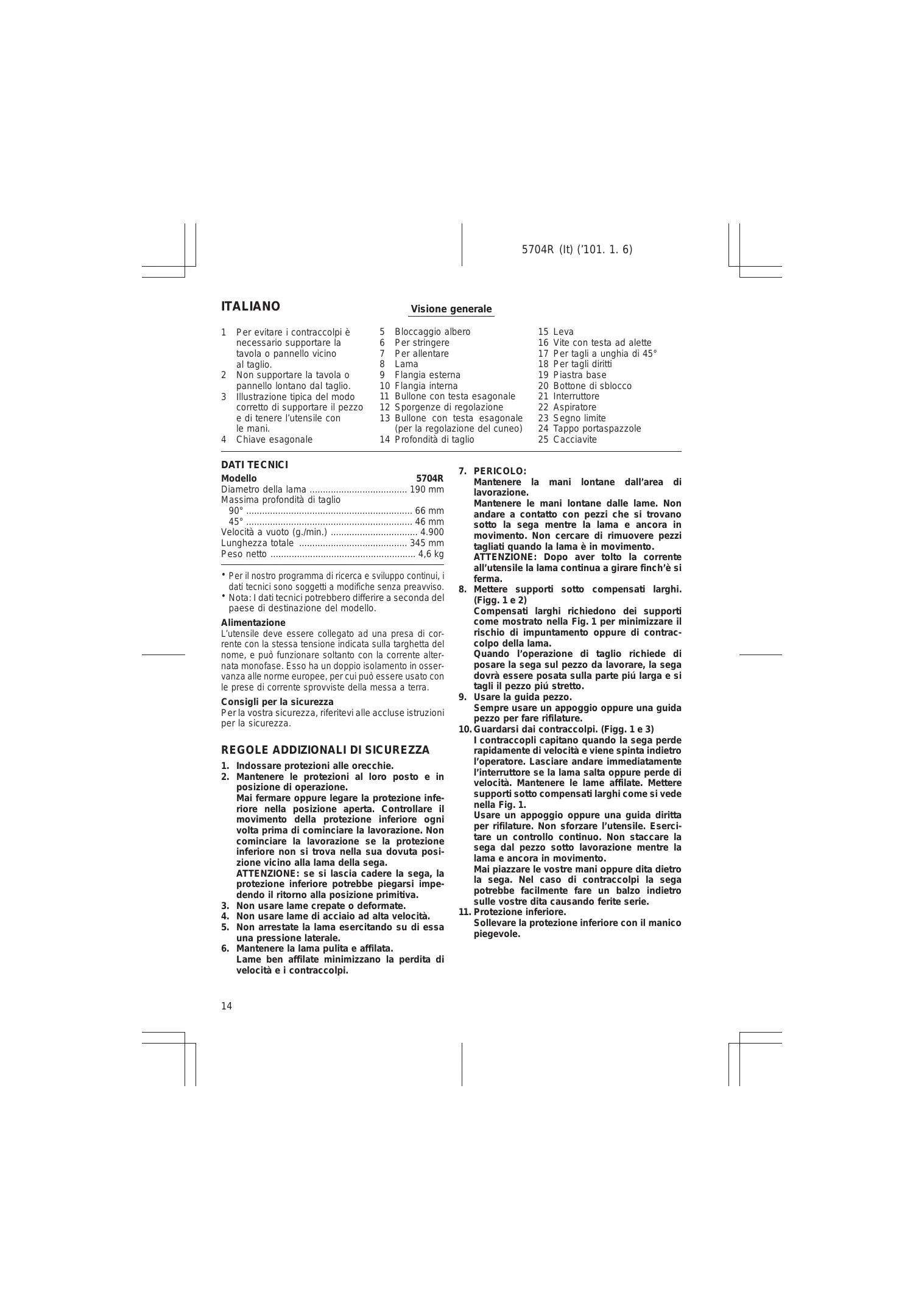pannello lontano dal taglio. 3__Illustrazione tipica del modo corretto di supportare il pezzo € di tenere l'utensile con le mani. 4 Chiave esagonale Per stringere Per allentare Lama wosou Flangia esterna 10 Flangia interna 11 Bullone con testa esagonale 12 Sporgenze di regolazione 13 Bullone con testa esagonale {per la regolazione del cuneo) 14 Profondità di taglio Bloccaggio albero 5704R (It) (101. 1. 6) Visione generale 15 Leva 16 Vite con testa ad alette 17 Per tagli a unghia di 45° 18 Per tagli dirit 19 Piastra base 20 Bottone di sblocco 21 Interruttore 22 Aspiratore 23 Segno limite 24 Tappo portaspazzole 25 Cacciavite DATI TECNICI Modello 5704R Diametro della lama 190 mm Velocità à vuoto (g./min.) . Lunghezza totale … Peso netto ….… + Peril nostro programma di icerca € sviluppo continui, dati tecnici sono soggett à modifiche senza preawviso