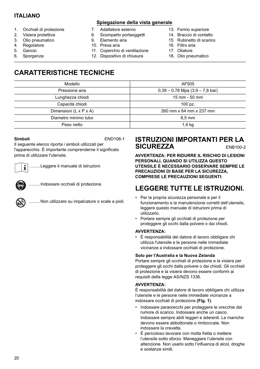 Portare sempre gli occhiali di protezione e la visiera per proteggere gli occhi da polvere o dai chiodi. Gli occhiali di protezione e la visiera devono essere conformi ai requisiti della legge AS/NZS 1336.