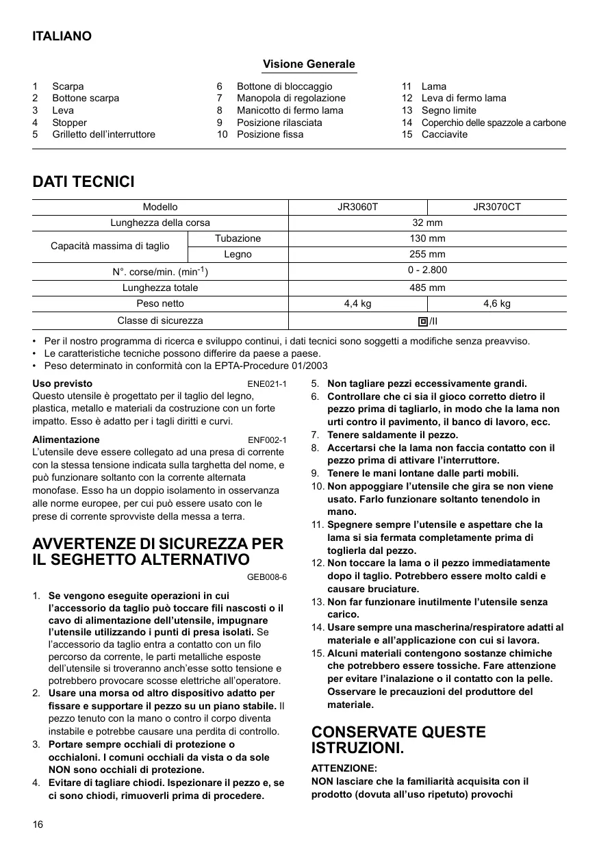 • Per il nostro programma di ricerca e sviluppo continui, i dati tecnici sono soggetti a modifiche senza preavviso. • Le caratteristiche tecniche possono differire da paese a paese. • Peso determinato in conformità con la EPTA-Procedure 01/2003 Uso previsto ENE021-1 Questo utensile è progettato per il taglio del legno, plastica, metallo e materiali da costruzione con un forte impatto. Esso è adatto per i tagli diritti e curvi. ENF002-1 Alimentazione L’utensile deve essere collegato ad una presa di corrente con la stessa tensione indicata sulla targhetta del nome, e può funzionare soltanto con la corrente alternata monofase. Esso ha un doppio isolamento in osservanza alle norme europee, per cui può essere usato con le prese di corrente sprovviste della messa a terra.