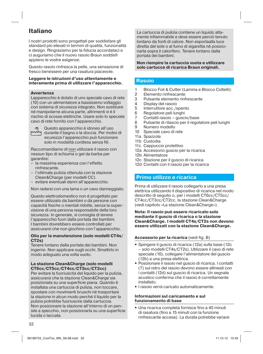 Italiano I nostri prodotti sono progettati per soddisfare gli standard più elevati in termini di qualità, funzionalità e design. Ringraziamo per la fiducia accordataci e ci auguriamo che il nuovo rasoio Braun soddisfi appieno le vostre esigenze. Questo rasoio rinfresca la pelle, una sensazione di fresco benessere per una rasatura piacevole. Leggere le istruzioni d’uso attentamente e interamente prima di utilizzare l’apparecchio. Avvertenza Lapparecchio è dotato di uno speciale cavo di rete (10) con un alimentatore a bassissimo voltaggio con sistema di sicurezza integrato. Non sostituire né manipolarne alcuna parte, altrimenti vi è il rischio di scosse elettriche. Usare solo lo speciale cavo di rete fornito con l’apparecchio. Questo apparecchio è idoneo all’uso durante il bagno o la doccia. Per motivi di sicurezza l’apparecchio può funzionare solo in modalità cordless senza fili. Raccomandiamo di non utilizzare il rasoio con nessun tipo di schiuma o gel da barba per garantire: – la massima esperienza con l’effetto rinfrescante. – l’ottimale pulizia ottenuta con la stazione Clean&Charge (per modelli CC). – evitare eventuali danni all’apparecchio. Non radersi con una lama o un cavo danneggiato. Questo elettrodomestico non è progettato per essere utilizzato da bambini o da persone con capacità fisiche o mentali ridotte, senza la supervisione di una persona responsabile della loro sicurezza. In generale, si consiglia di tenere l’apparecchio fuori dalla portata dei bambini. I bambini dovrebbero essere controllati per assicurarsi che non giochino con l’apparecchio. Olio per la manutenzione (solo modelli CT4s/ CT2s) Tenere lontano dalla portata dei bambini. Non ingerire. Non applicare sugli occhi. Smaltirlo in modo adeguato una volta vuoto. La stazione Clean&Charge (solo modelli CT6cc/CT5cc/CT4cc/CT3cc/CT2cc) Per evitare la fuoriuscita del liquido per la pulizia, assicurarsi che la stazione Clean&Charge sia posizionata su una superficie piana. Quando è installata una cartuccia di pulizia, non toccare, spostare con movimenti bruschi né trasportare la stazione in alcun modo perché il liquido per la pulizia potrebbe fuoriuscire dalla cartuccia. Non posizionare la stazione all’interno di un pensile a specchio, non posizionarla su una superficie lucida o laccata. La cartuccia di pulizia contiene un liquido altamente infiammabile e deve essere perciò tenuto lontano da fonti di calore. Non esporlaalla luce diretta del sole o al fumo di sigaretta né posizionarla sopra il calorifero. Tenere lontano dalla portata dei bambini. Non riempire la cartuccia vuota e utilizzare solo cartucce di ricarica Braun originali. Rasoio