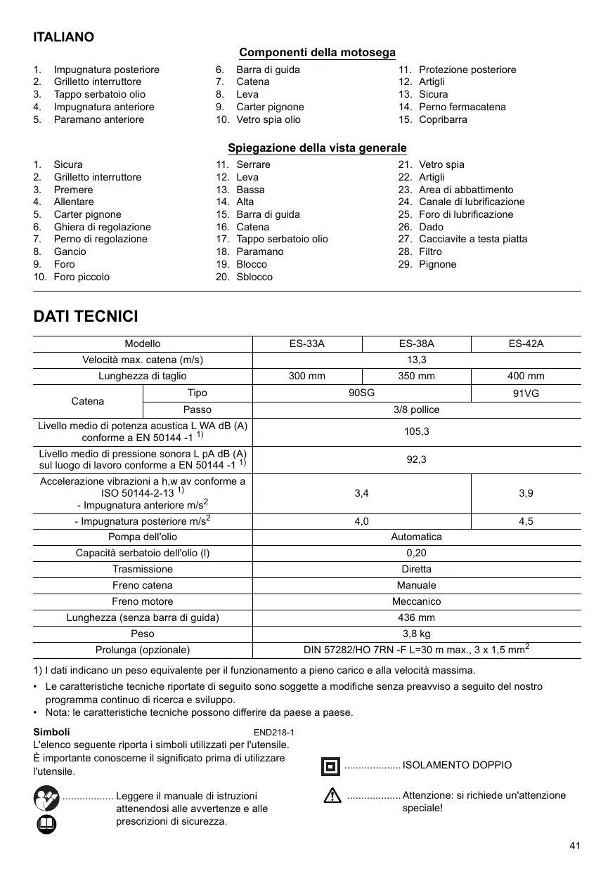 Serrare Leva Bassa Alta Barra di guida Catena Tappo serbatoio olio Paramano Blocco Sblocco Vetro spia Artigli Area di abbattimento Canale di lubrificazione Foro di lubrificazione Dado Cacciavite a testa piatta Filtro Pignone DATI TECNICI Modello ES-33A ES-38A Velocità max. catena (m/s) Lunghezza di taglio 300 mm Tipo Catena ES-42A 13,3 350 mm Passo 91VG 3/8 pollice Livello medio di potenza acustica L WA dB (A) conforme a EN 50144 -1 1) 105,3 Livello medio di pressione sonora L pA dB (A) sul luogo di lavoro conforme a EN 50144 -1 1) 92,3 Accelerazione vibrazioni a h,w av conforme a ISO 50144-2-13 1) - Impugnatura anteriore m/s2 3,4 - Impugnatura posteriore m/s2 4,0 Pompa dell'olio 400 mm 90SG 3,9 4,5 Automatica Capacità serbatoio dell'olio (l) 0,20 Trasmissione Diretta Freno catena Manuale Freno motore Meccanico Lunghezza (senza barra di guida) 436 mm Peso 3,8 kg Prolunga (opzionale) DIN 57282/HO 7RN -F L=30 m max., 3 x 1,5 mm2
