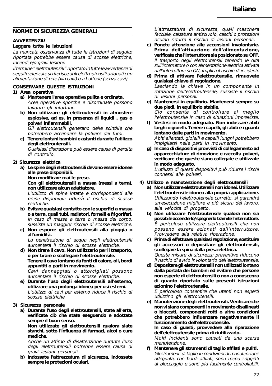 a) Non utilizzare elettroutensili non idonei. Utilizzare l'elettroutensile idoneo alla propria applicazione. Utilizzando l'elettroutensile corretto, si garantirà un'esecuzione migliore e più sicura del lavoro, alla velocità di progetto. b) Non utilizzare l'elettroutensile qualora non sia possibile accenderlo/spegnerlo tramite l'interruttore. É pericoloso utilizzare elettroutensili che non possano essere azionati dall'interruttore. Provvedere alla relativa riparazione. c) Prima di effettuare qualsiasi regolazione, sostituire gli accessori o depositare gli elettroutensili, scollegare la spina dalla presa elettrica. Queste misure di sicurezza preventive riducono il rischio di avvio involontario dell'elettroutensile. d) Depositare gli elettroutensili non utilizzati lontano dalla portata dei bambini ed evitare che persone non esperte di elettroutensili o non a conoscenza di quanto riportato sulle presenti istruzioni azionino l'elettroutensile. É pericoloso consentire che utenti non esperti utilizzino gli elettroutensili. e) Manutenzione degli elettroutensili. Verificare che non vi siano componenti in movimento disallineati o bloccati, componenti rotti o altre condizioni che potrebbero influenzare negativamente il funzionamento dell'elettroutensile. In caso di guasti, provvedere alla riparazione dell'elettroutensile prima di riutilizzarlo. Molti incidenti sono causati da una scarsa manutenzione. f) Mantenere gli strumenti di taglio affilati e puliti. Gli strumenti di taglio in condizioni di manutenzione adeguata, con bordi affilati, sono meno soggetti al bloccaggio e sono più facilmente controllabili.