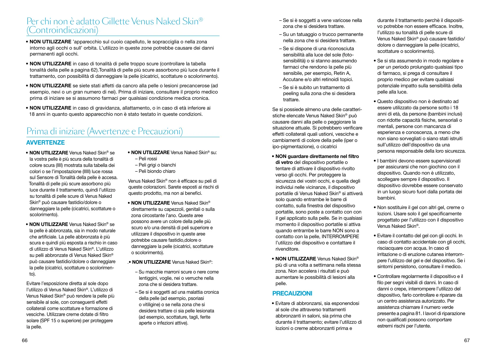 - NON UTILIZZARE Venus Naked Skin® direttamente su capezzoli, genitali o sulla zona circostante l’ano. Queste aree possono avere un colore della pelle più scuro e/o una densità di peli superiore e utilizzare il dispositivo in queste aree potrebbe causare fastidio,dolore o danneggiare la pelle (cicatrici, scottature o scolorimento). .• NON UTILIZZARE Venus Naked Skin®: – Su macchie marroni scure o nere come lentiggini, voglie, nei o verruche nella zona che si desidera trattare. – Se si è soggetti ad una malattia cronica della pelle (ad esempio, psoriasi o vitiligine) o se nella zona che si desidera trattare ci sia pelle lesionata (ad esempio, scottature, tagli, ferite aperte o infezioni attive). – Se si è soggetti a vene varicose nella zona che si desidera trattare. – Su un tatuaggio o trucco permanente nella zona che si desidera trattare. – Se si dispone di una riconosciuta sensibilità alla luce del sole (foto sensibilità) o si stanno assumendo farmaci che rendono la pelle più sensibile, per esempio, Retin A, Accutane e/o altri retinoidi topici. – Se si è subito un trattamento di peeling sulla zona che si desidera trattare. Se si possiede almeno una delle caratteristiche elencate Venus Naked Skin® può causare danni alla pelle o peggiorare la situazione attuale. Si potrebbero verificare effetti collaterali quali ustioni, vesciche e cambiamenti di colore della pelle (iper o ipo-pigmentazione), o cicatrici