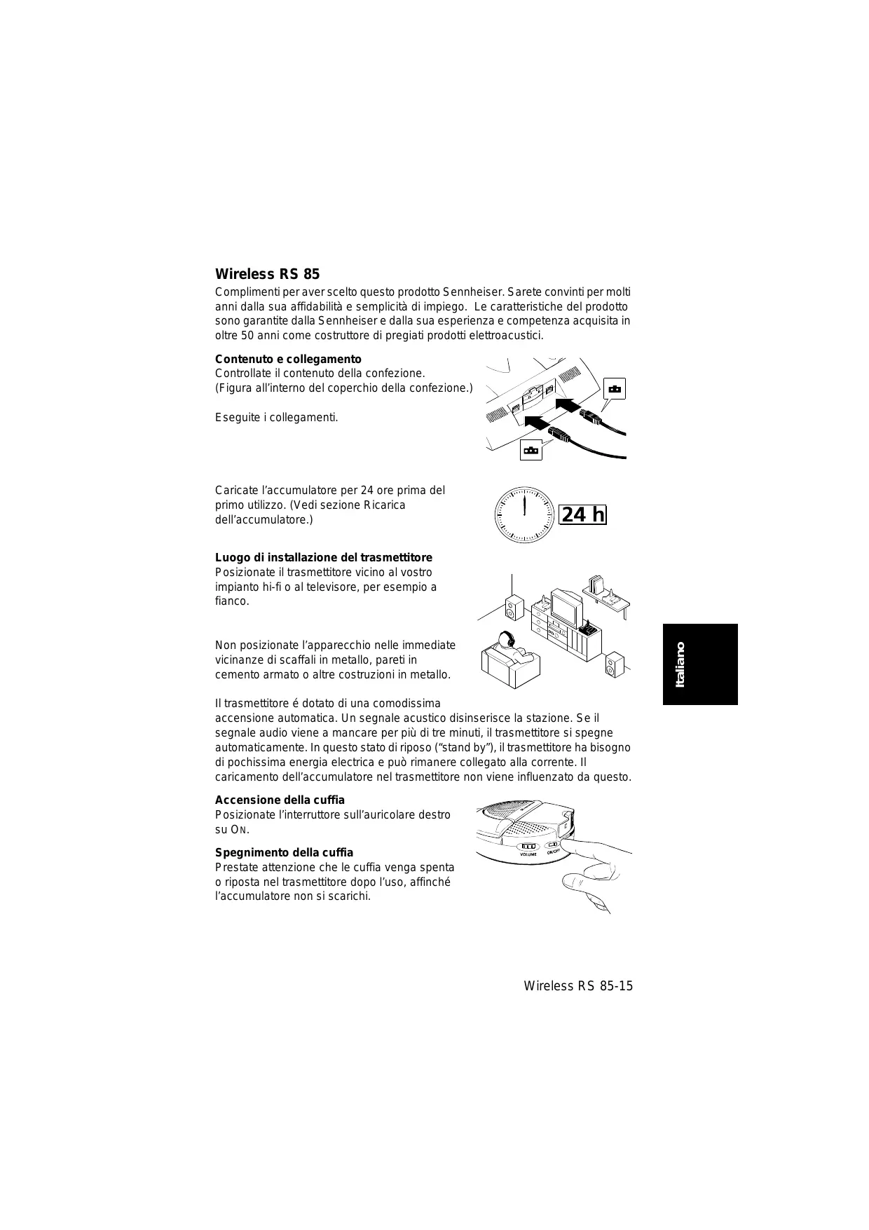 Wireless RS 85 Complimenti per aver scelto questo prodotto Sennheiser. Sarete convinti per molti anni dalla sua affidabilità e semplicità di impiego. Le caratteristiche del prodotto sono garantite dalla Sennheiser e dalla sua esperienza e competenza acquisita in oltre 50 anni come costruttore di pregiati prodotti elettroacustici. Contenuto e collegamento Controllate il contenuto della confezione. {Figura allinterno del coperchio della confezione.) Eseguite i collegamenti Caricate l'accumulatore per 24 ore prima del primo utilizzo. (Vedi sezione Ricarica dell'accumulatore.) Luogo di installazione del trasmettitore Posizionate il trasmettitore vicino al vostro impianto hi-fi o al televisore, per esempio à fianco. Non posizionate l'apparecchio nelle immediate vicinanze di scaffali in metallo, paret in cemento armato o altre costruzioni in metallo. Iltrasmettitore é dotato di una comodissima accensione automatica. Un segnale acustico disinserisce la stazione. Se il segnale audio viene a mancare per più di tre minuti il trasmettitore si spegne automaticamente. In questo stato di riposo (“stand by", iltrasmetttore ha bisogno di pochissima energia electrica e pud rimanere collegato alla corrente. Il caricamento dell'accumulatore nel trasmettitore non viene influenzato da questo. Accensione della cuffia Posizionate l'interruttore sull'auricolare destro su ON. Spegnimento della cuffia Prestate attenzione che le cuffia venga spenta o riposta nel trasmetttore dopo l'uso, affinché l'accumulatore non si scarichi. Wireless RS 85-15 Italiano