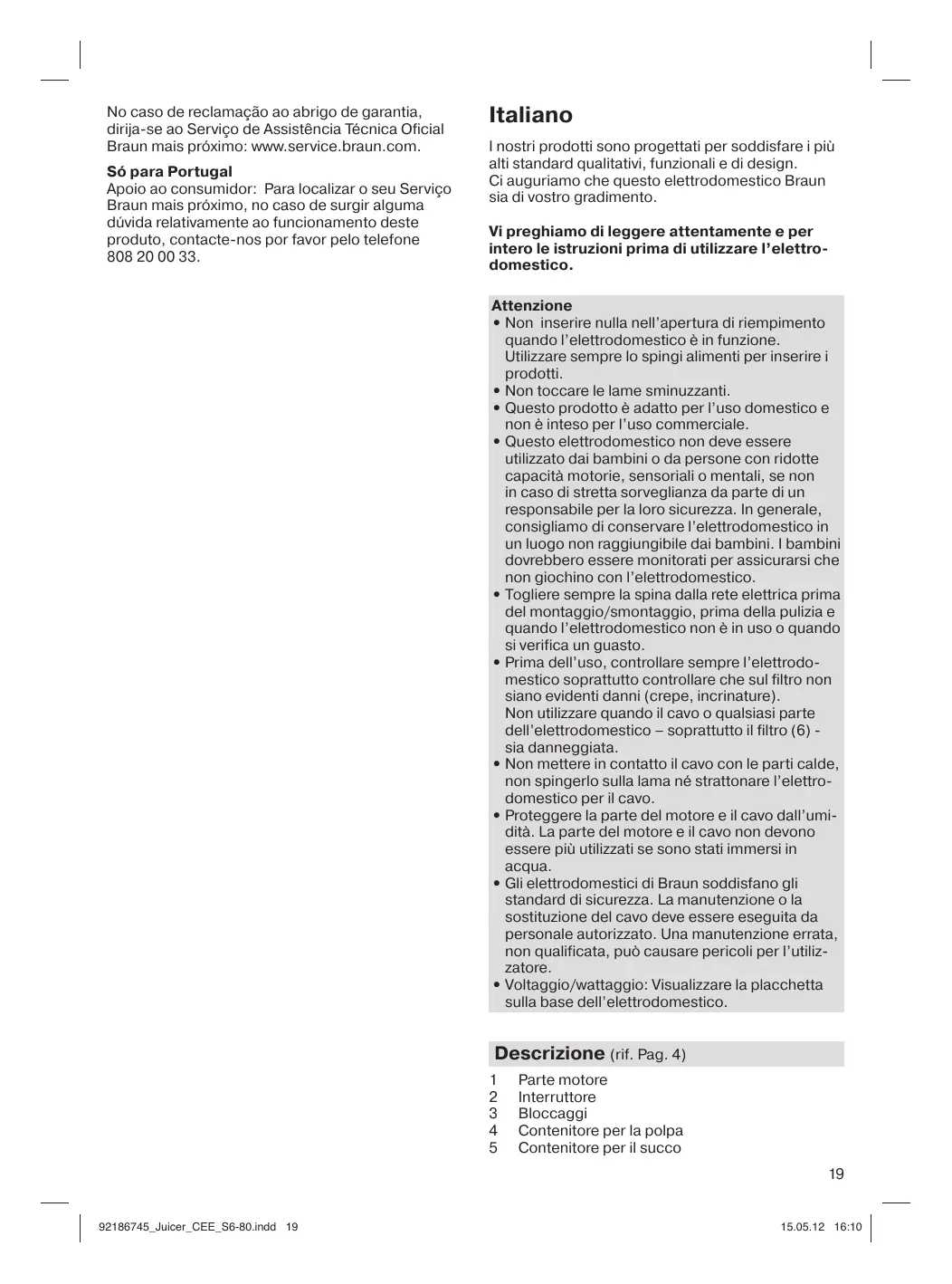 Italiano I nostri prodotti sono progettati per soddisfare i più alti standard qualitativi, funzionali e di design. Ci auguriamo che questo elettrodomestico Braun sia di vostro gradimento. Vi preghiamo di leggere attentamente e per intero le istruzioni prima di utilizzare l’elettrodomestico. Attenzione • Non inserire nulla nell’apertura di riempimento quando l’elettrodomestico è in funzione. Utilizzare sempre lo spingi alimenti per inserire i prodotti. • Non toccare le lame sminuzzanti. • Questo prodotto è adatto per l’uso domestico e non è inteso per l’uso commerciale. • Questo elettrodomestico non deve essere utilizzato dai bambini o da persone con ridotte capacità motorie, sensoriali o mentali, se non in caso di stretta sorveglianza da parte di un responsabile per la loro sicurezza. In generale, consigliamo di conservare l’elettrodomestico in un luogo non raggiungibile dai bambini. I bambini dovrebbero essere monitorati per assicurarsi che non giochino con l’elettrodomestico. • Togliere sempre la spina dalla rete elettrica prima del montaggio/smontaggio, prima della pulizia e quando l’elettrodomestico non è in uso o quando si verifica un guasto. • Prima dell’uso, controllare sempre l’elettrodomestico soprattutto controllare che sul filtro non siano evidenti danni (crepe, incrinature). Non utilizzare quando il cavo o qualsiasi parte dell’elettrodomestico – soprattutto il filtro (6) sia danneggiata. • Non mettere in contatto il cavo con le parti calde, non spingerlo sulla lama né strattonare l’elettrodomestico per il cavo. • Proteggere la parte del motore e il cavo dall’umidità. La parte del motore e il cavo non devono essere più utilizzati se sono stati immersi in acqua. • Gli elettrodomestici di Braun soddisfano gli standard di sicurezza. La manutenzione o la sostituzione del cavo deve essere eseguita da personale autorizzato. Una manutenzione errata, non qualificata, può causare pericoli per l’utilizzatore. • Voltaggio/wattaggio: Visualizzare la placchetta sulla base dell’elettrodomestico.