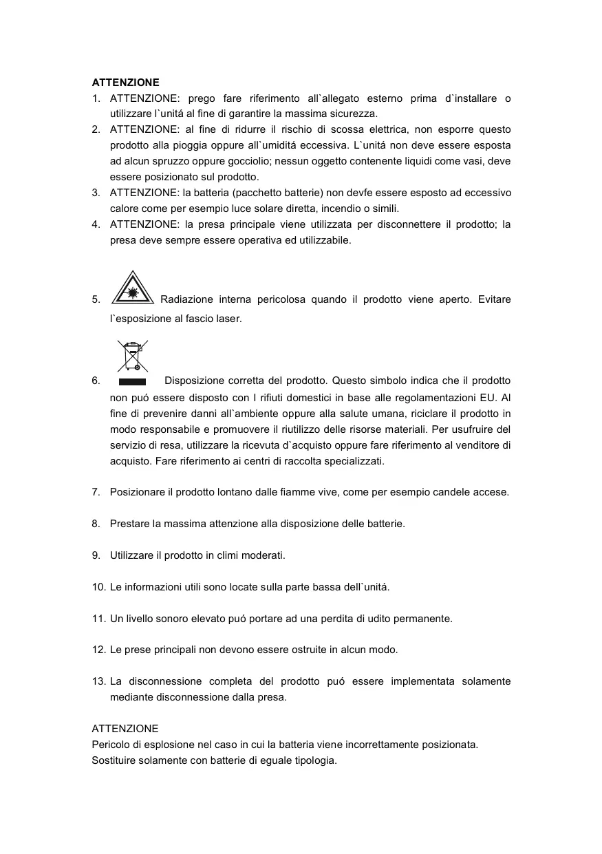 mediante disconnessione dalla presa. ATTENZIONE Pericolo di esplosione nel caso in cui la batteria viene incorrettamente posizionata. Sostituire solamente con batterie di eguale tipologia. AVVERTENZE NON ESPORRE LʼAPPARECCHIO A PIOGGIA O UMIDITÀ, PERICOLO DI INCENDIO O SCOSSE ELETTRICHE. ATTENZIONE