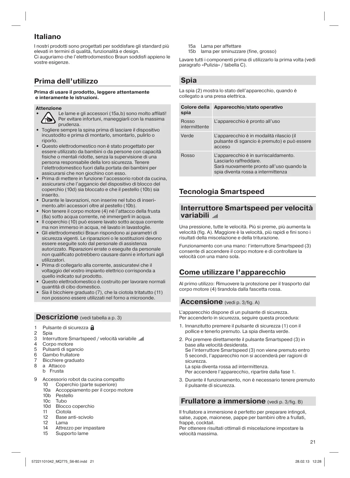 Italiano I nostri prodotti sono progettati per soddisfare gli standard più elevati in termini di qualità, funzionalità e design. Ci auguriamo che l’elettrodomestico Braun soddisfi appieno le vostre esigenze. Prima dell’utilizzo Prima di usare il prodotto, leggere attentamente e interamente le istruzioni. Attenzione Le lame e gli accessori (15a,b) sono molto affilati! Per evitare infortuni, maneggiarli con la massima prudenza.