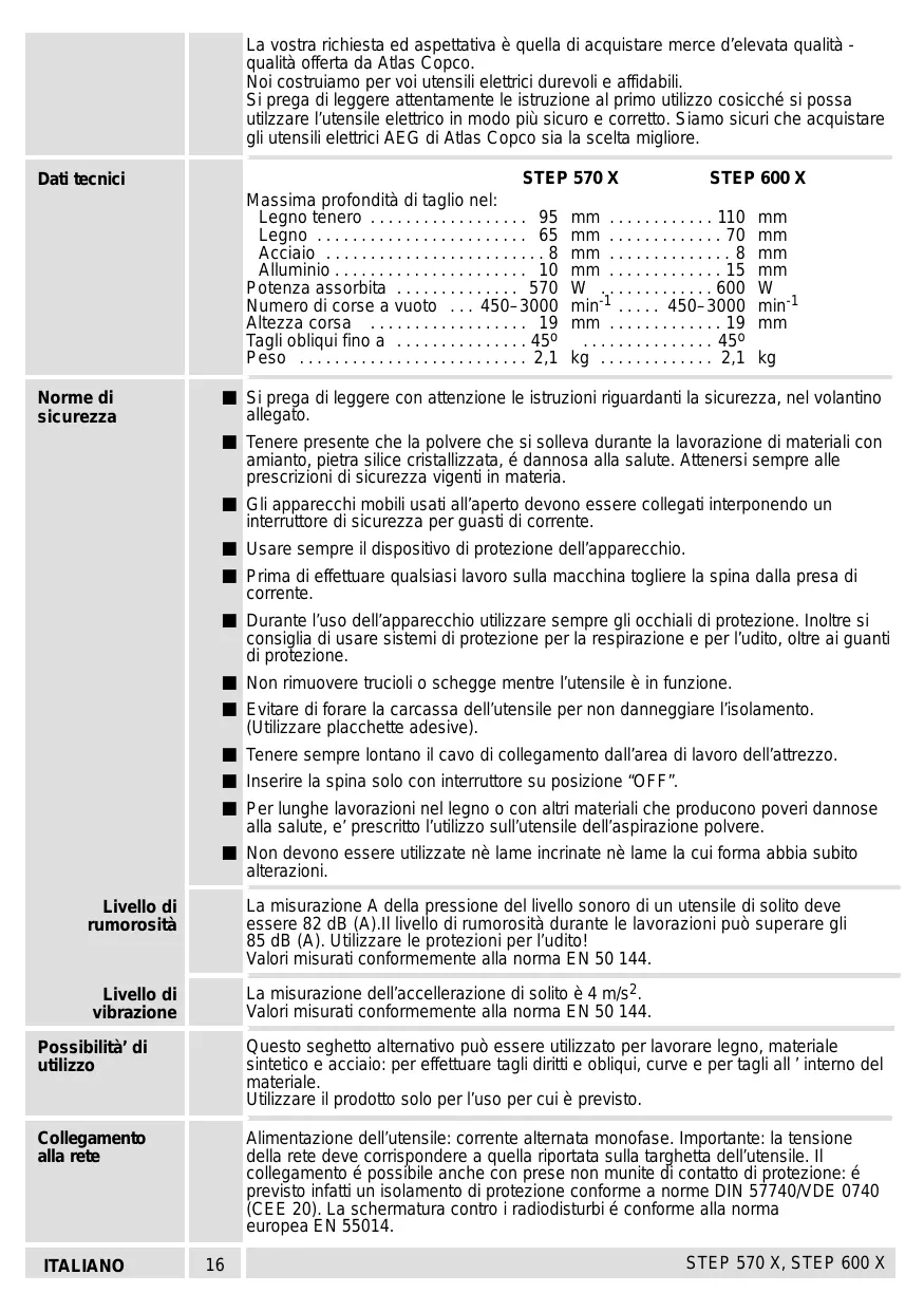 - La vostra richiesta ed aspettativa è quella di acquistare merce d’elevata qualità qualità offerta da Atlas Copco. Noi costruiamo per voi utensili elettrici durevoli e affidabili. Si prega di leggere attentamente le istruzione al primo utilizzo cosicché si possa utilzzare l’utensile elettrico in modo più sicuro e corretto. Siamo sicuri che acquistare gli utensili elettrici AEG di Atlas Copco sia la scelta migliore. STEP 570 X STEP 600 X Massima profondità di taglio nel: Legno tenero p. 95