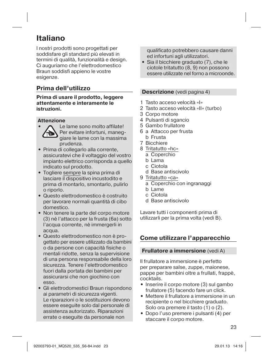 Italiano I nostri prodotti sono progettati per soddisfare gli standard più elevati in termini di qualità, funzionalità e design. Ci auguriamo che l’elettrodomestico Braun soddisfi appieno le vostre esigenze. Prima dell’utilizzo Prima di usare il prodotto, leggere attentamente e interamente le istruzioni. Attenzione Le lame sono molto affilate! Per evitare infortuni, maneggiare le lame con la massima prudenza.