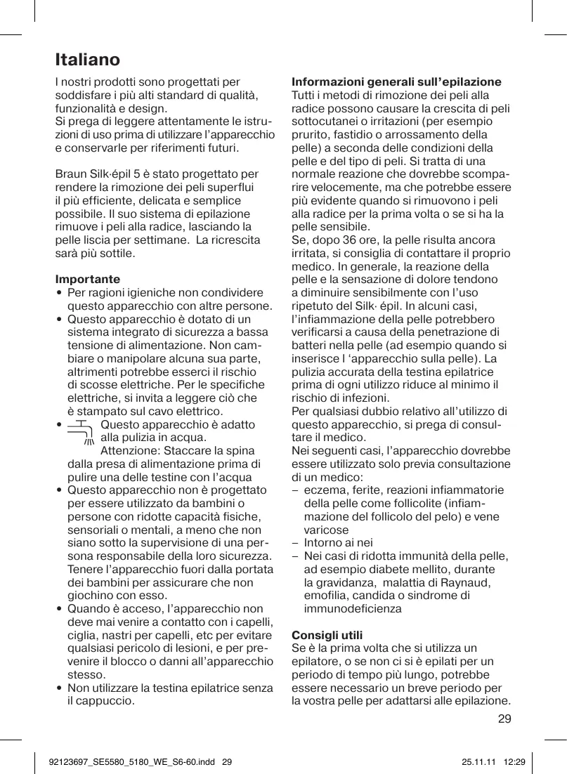 Italiano I nostri prodotti sono progettati per soddisfare i più alti standard di qualità, funzionalità e design. Si prega di leggere attentamente le istruzioni di uso prima di utilizzare l’apparecchio e conservarle per riferimenti futuri. Braun Silk·épil 5 è stato progettato per rendere la rimozione dei peli superflui il più efficiente, delicata e semplice possibile. Il suo sistema di epilazione rimuove i peli alla radice, lasciando la pelle liscia per settimane. La ricrescita sarà più sottile. Importante