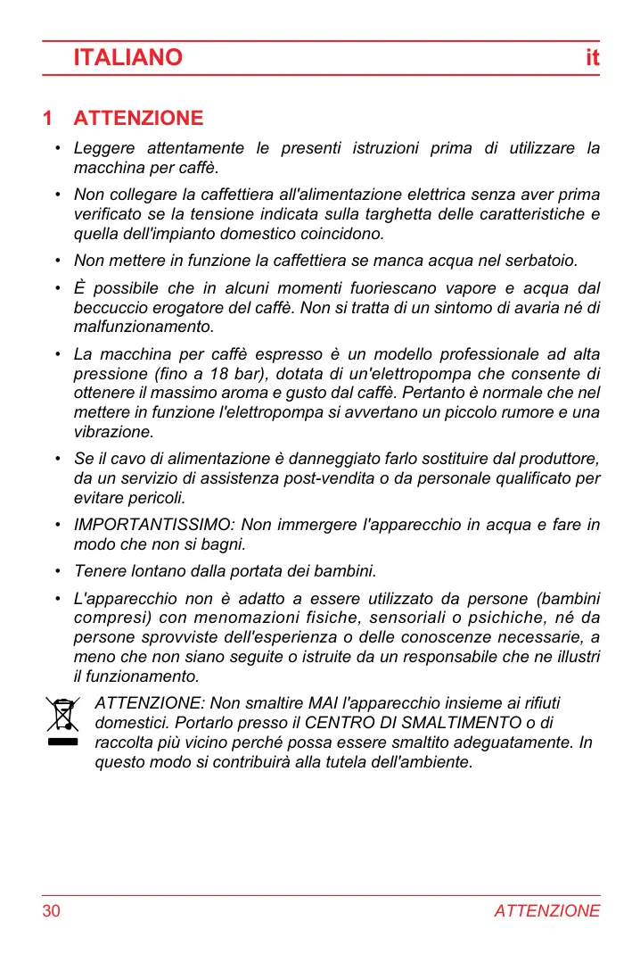 ITALIANO it ATTENZIONE Leggere attentamente le presenti istruzioni prima di utilizzare la macchina per caffè. Non collegare la caffettiera all'alimentazione elettrica senza aver prima verificato se la tensione indicata sulla targhetta delle caratteristiche e quella dell'impianto domestico coincidono. Non mettere in funzione la caffettiera se manca acqua nel serbatoio. Ë possibile che in alcuni momenti fuoriescano vapore e acqua dal beccuccio erogatore del caffè. Non si tratta di un sintomo di avaria né di malfunzionamento. La macchina per caffè espresso & un modello professionale ad alta pressione (fino a 18 bar), dotata di un'elettropompa che consente di ottenere il massimo aroma e gusto dal caffè. Pertanto à normale che nel mettere in funzione l'elettropompa si avvertano un piccolo rumore e una vibrazione. Se il cavo di alimentazione & danneggiato farlo sostituire dal produttore, da un servizio di assistenza post-vendita o da personale qualificato per evitare pericoli. IMPORTANTISSIMO: Non immergere l'apparecchio in acqua e fare in modo che non si bagni. Tenere lontano dalla portata dei bambini. L'apparecchio non è adatto a essere utilizzato da persone (bambini compresi) con menomazioni fisiche, sensoriali o psichiche, né da persone sprovviste dell'esperienza o delle conoscenze necessarie, a meno che non siano seguite o istruite da un responsabile che ne illustri il funzionamento. ATTENZIONE: Non smaltire MAI l'apparecchio insieme ai rifiuti domestici. Portarlo presso il CENTRO DI SMALTIMENTO o di = accolta più vicino perché possa essere smaltito adeguatamente. In questo modo si contribuirà alla tutela dell'ambiente.