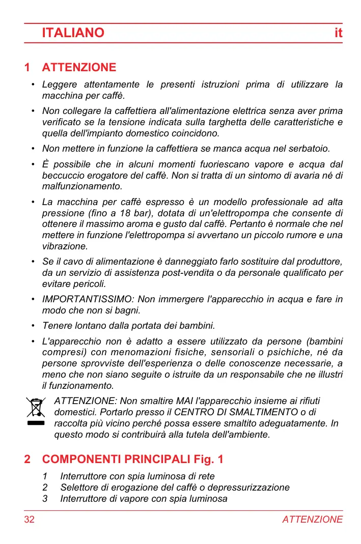 ATTENZIONE: Non smaltire MAI l'apparecchio insieme ai rifiuti domestici. Portarlo presso il CENTRO DI SMALTIMENTO o di raccolta più vicino perché possa essere smaltito adeguatamente. In questo modo si contribuirà alla tutela dell'ambiente. 2 COMPONENTI PRINCIPALI Fig. 1