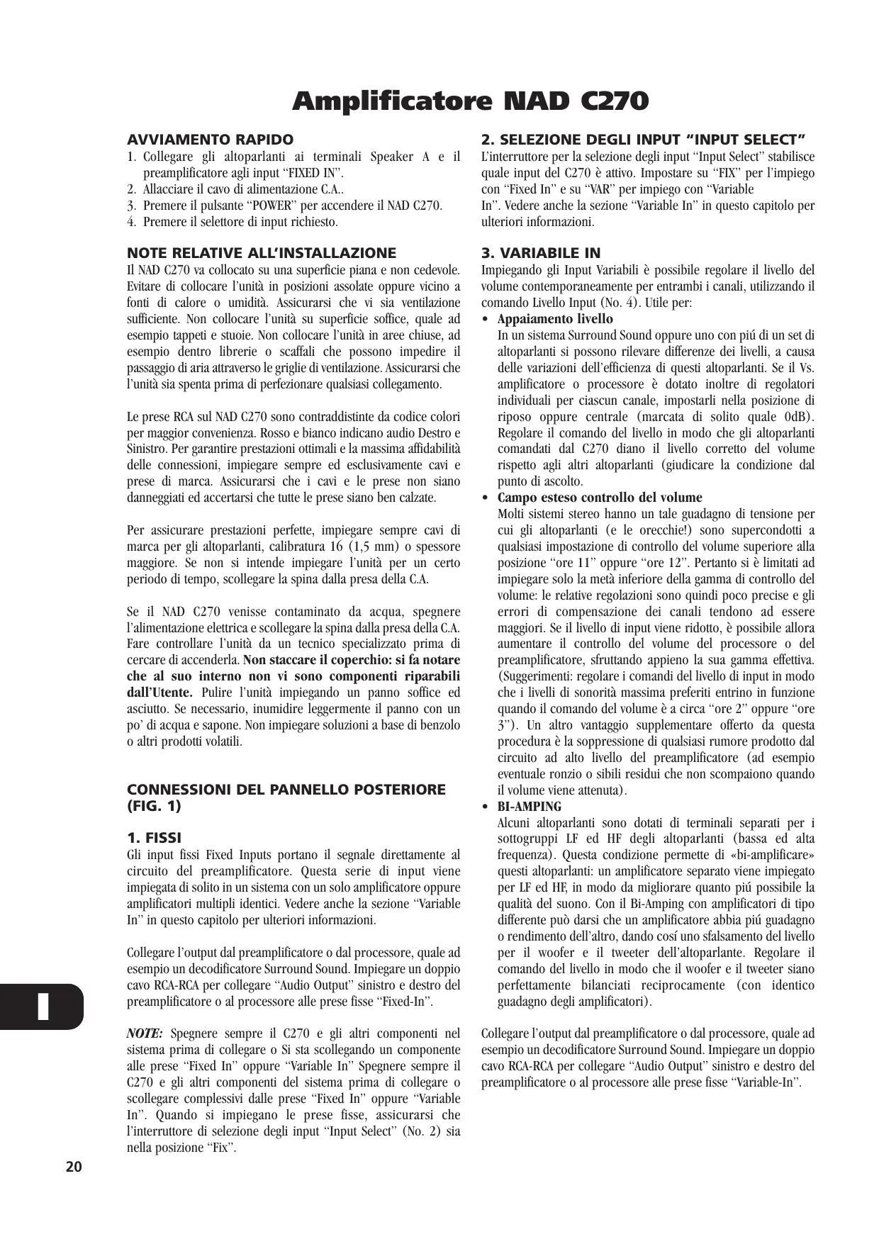- BI-AMPING Alcuni altoparlanti sono dotati di terminali separati per i sottogruppi LF ed HF degli altoparlanti (bassa ed alta frequenza). Questa condizione permette di «bi-amplificare» questi altoparlanti: un amplificatore separato viene impiegato per LF ed HF, in modo da migliorare quanto piú possibile la qualità del suono. Con il Bi-Amping con amplificatori di tipo differente può darsi che un amplificatore abbia piú guadagno o rendimento dell’altro, dando cosí uno sfalsamento del livello per il woofer e il tweeter dell’altoparlante. Regolare il comando del livello in modo che il woofer e il tweeter siano perfettamente bilanciati reciprocamente (con identico guadagno degli amplificatori). Le prese RCA sul NAD C270 sono contraddistinte da codice colori per maggior convenienza. Rosso e bianco indicano audio Destro e Sinistro. Per garantire prestazioni ottimali e la massima affidabilità delle connessioni, impiegare sempre ed esclusivamente cavi e prese di marca. Assicurarsi che i cavi e le prese non siano danneggiati ed accertarsi che tutte le prese siano ben calzate. Per assicurare prestazioni perfette, impiegare sempre cavi di marca per gli altoparlanti, calibratura 16 (1,5 mm) o spessore maggiore. Se non si intende impiegare l’unità per un certo periodo di tempo, scollegare la spina dalla presa della C.A. Se il NAD C270 venisse contaminato da acqua, spegnere l’alimentazione elettrica e scollegare la spina dalla presa della C.A. Fare controllare l’unità da un tecnico specializzato prima di cercare di accenderla. Non staccare il coperchio: si fa notare che al suo interno non vi sono componenti riparabili dall’Utente. Pulire l’unità impiegando un panno soffice ed asciutto. Se necessario, inumidire leggermente il panno con un po’ di acqua e sapone. Non impiegare soluzioni a base di benzolo o altri prodotti volatili.