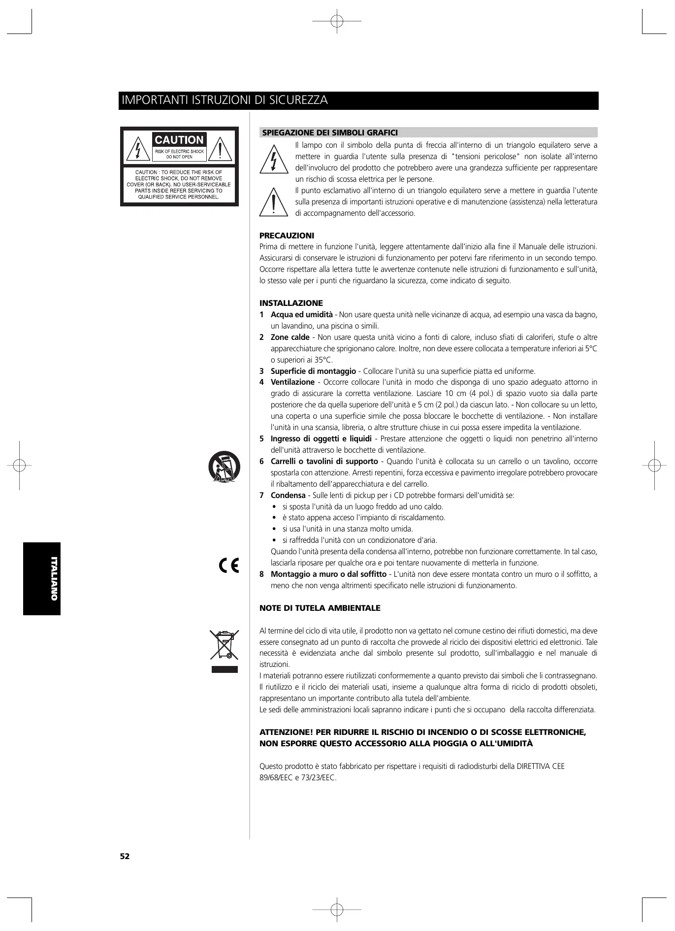 ATTENTION DANGER. POUR ÉVITER TOUT RISQUE D'INCENDIE OU DE CHOC ÉLECTRIQUE, N'EXPOSEZ JAMAIS CET APPAREIL A LA PLUIE OU A L'HUMIDITÉ. Ce produit a été fabriqué de manière à être conforme aux exigences concernant les interférence radio des DIRECTIVES CEE 89/68/EEC et 73/23/EEC.
