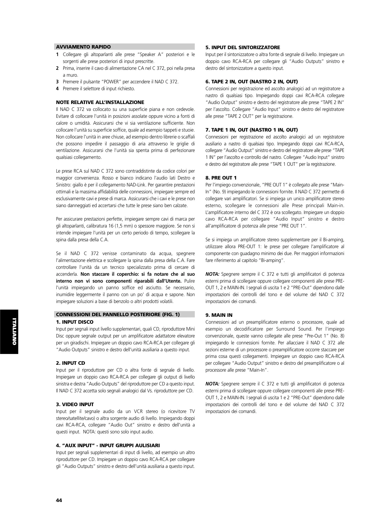 DEUTSCH Pour vous faciliter la tâche, les bornes RCA de votre NAD C 372 sont codées couleur. Rouge pour l'audio droite, blanc pour l'audio gauche, et jaune pour la Liaison-NAD. N'utiliser que des câbles et des connecteurs de très bonne qualité de manière à obtenir un branchement dont la fiabilité est parfaite et les performances optimales. Vérifier que les câbles et les connecteurs ne présentent aucune détérioration, et que tous les connecteurs sont bien enfoncés jusqu'en butée.