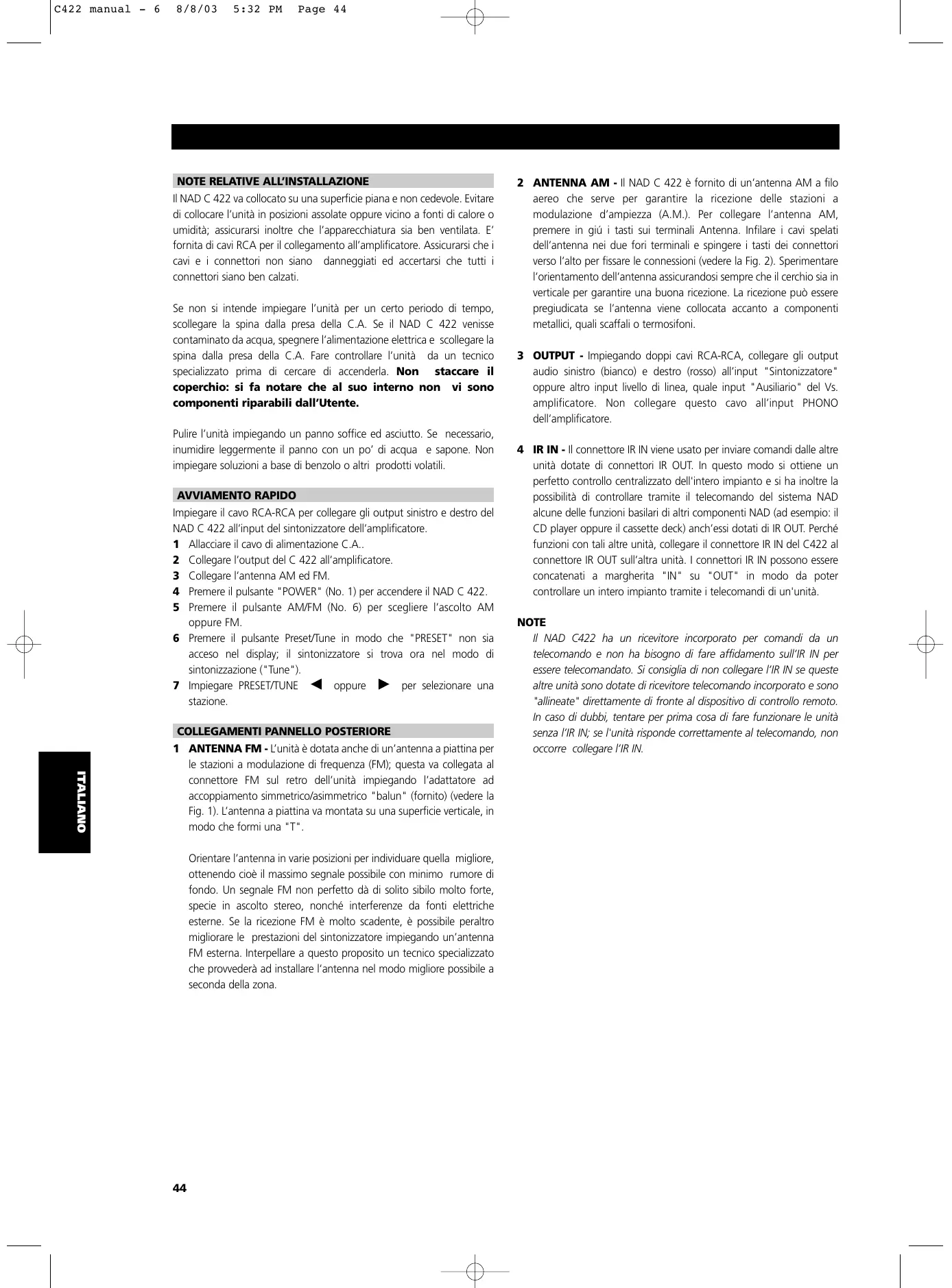 Se non si intende impiegare l'unità per un duro periodo di tempo, scollegare la spina alla presa della C.A. Se il NAD C 422 venisse contaminato da acqua, spegnere l'alimentazione elettrica e scollegare la spina alla presa della C.A. Fare controllare l'unità da un tecnico specializzato prima di cercare di accenderla. Non staccare il coperchio: si fa notare che al suo interno non vi sono componenti riparabili dall'Utente.