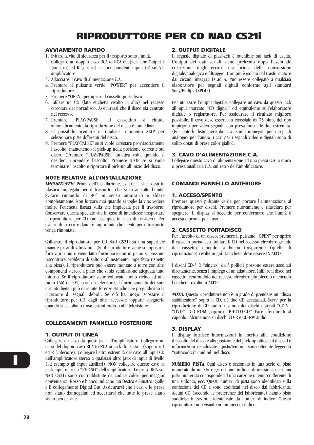 Scarica le istruzioni per il tuo Lettore CD in formato PDF gratuitamente! Trova il tuo manuale C521I - NAD e riprendi in mano il tuo dispositivo elettronico. In questa pagina sono pubblicati tutti i documenti necessari per l'utilizzo del tuo dispositivo. C521I del marchio NAD.