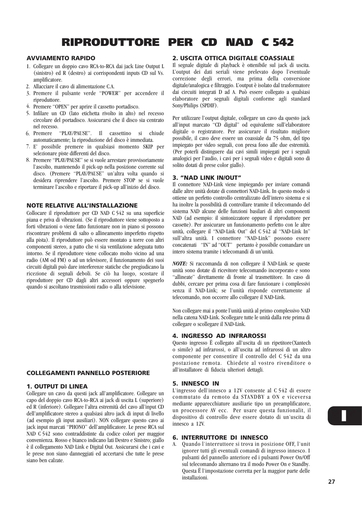 Scarica le istruzioni per il tuo Lettore CD in formato PDF gratuitamente! Trova il tuo manuale C542 - NAD e riprendi in mano il tuo dispositivo elettronico. In questa pagina sono pubblicati tutti i documenti necessari per l'utilizzo del tuo dispositivo. C542 del marchio NAD.