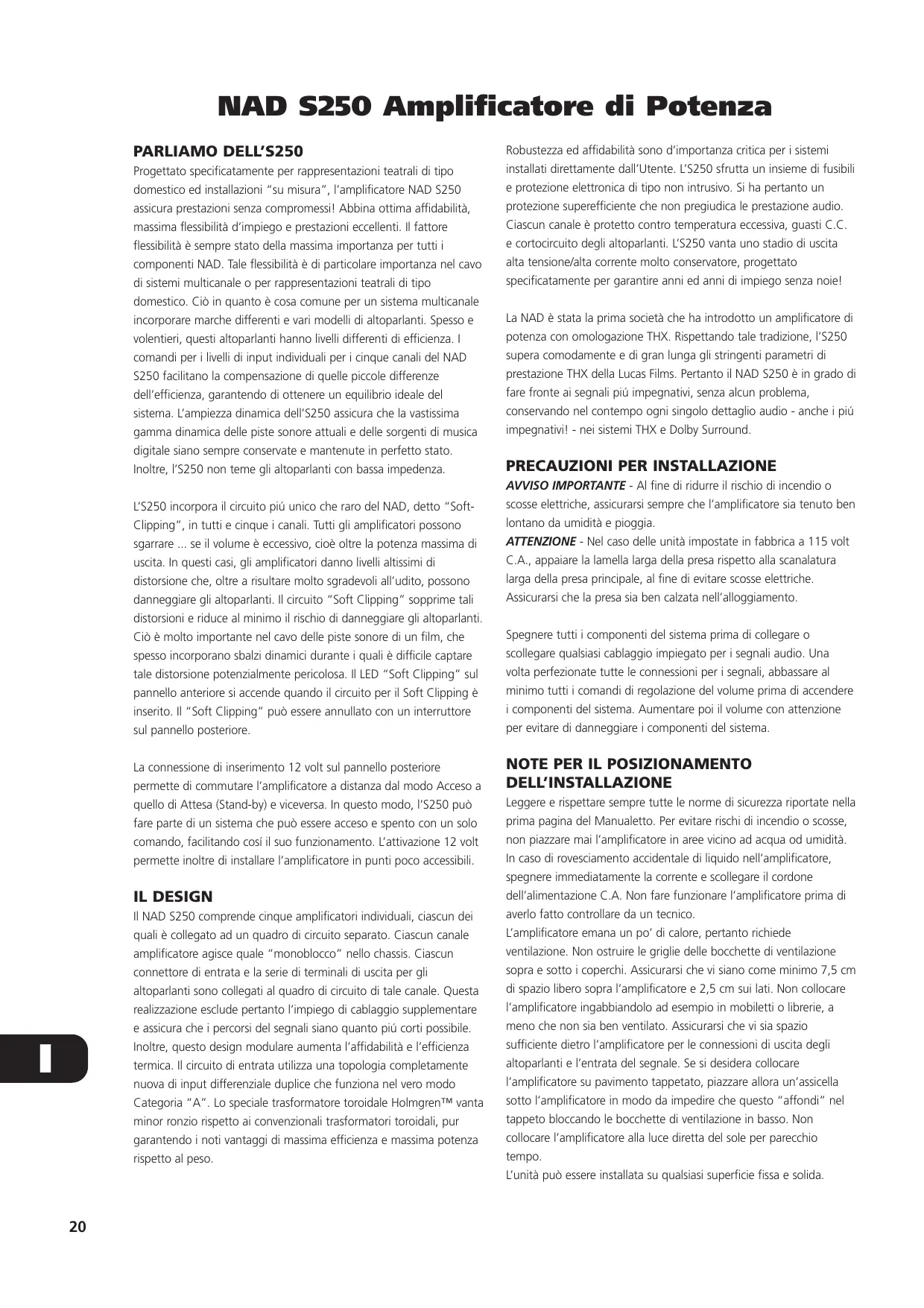 Progettato specificatamente per rappresentazioni teatrali di tipo domestico ed installazioni “su misura”, l’amplificatore NAD S250 assicura prestazioni senza compromessi! Abbina ottima affidabilità, massima flessibilità d’impiego e prestazioni eccellenti. Il fattore flessibilità è sempre stato della massima importanza per tutti i componenti NAD. Tale flessibilità è di particolare importanza nel cavo di sistemi multicanale o per rappresentazioni teatrali di tipo domestico. Ciò in quanto è cosa comune per un sistema multicanale incorporare marche differenti e vari modelli di altoparlanti. Spesso e volentieri, questi altoparlanti hanno livelli differenti di efficienza. I comandi per i livelli di input individuali per i cinque canali del NAD S250 facilitano la compensazione di quelle piccole differenze dell’efficienza, garantendo di ottenere un equilibrio ideale del sistema. L’ampiezza dinamica dell’S250 assicura che la vastissima gamma dinamica delle piste sonore attuali e delle sorgenti di musica digitale siano sempre conservate e mantenute in perfetto stato. Inoltre, l’S250 non teme gli altoparlanti con bassa impedenza. L’S250 incorpora il circuito piú unico che raro del NAD, detto “SoftClipping”, in tutti e cinque i canali. Tutti gli amplificatori possono sgarrare ... se il volume è eccessivo, cioè oltre la potenza massima di uscita. In questi casi, gli amplificatori danno livelli altissimi di distorsione che, oltre a risultare molto sgradevoli all’udito, possono danneggiare gli altoparlanti. Il circuito “Soft Clipping” sopprime tali distorsioni e riduce al minimo il rischio di danneggiare gli altoparlanti. Ciò è molto importante nel cavo delle piste sonore di un film, che spesso incorporano sbalzi dinamici durante i quali è difficile captare tale distorsione potenzialmente pericolosa. Il LED “Soft Clipping” sul pannello anteriore si accende quando il circuito per il Soft Clipping è inserito. Il “Soft Clipping” può essere annullato con un interruttore sul pannello posteriore. La connessione di inserimento 12 volt sul pannello posteriore permette di commutare l’amplificatore a distanza dal modo Acceso a quello di Attesa (Stand-by) e viceversa. In questo modo, l’S250 può fare parte di un sistema che può essere acceso e spento con un solo comando, facilitando cosí il suo funzionamento. L’attivazione 12 volt permette inoltre di installare l’amplificatore in punti poco accessibili. IL DESIGN Il NAD S250 comprende cinque amplificatori individuali, ciascun dei quali è collegato ad un quadro di circuito separato. Ciascun canale amplificatore agisce quale “monoblocco” nello chassis. Ciascun connettore di entrata e la serie di terminali di uscita per gli altoparlanti sono collegati al quadro di circuito di tale canale. Questa realizzazione esclude pertanto l’impiego di cablaggio supplementare e assicura che i percorsi del segnali siano quanto piú corti possibile. Inoltre, questo design modulare aumenta l’affidabilità e l’efficienza termica. Il circuito di entrata utilizza una topologia completamente nuova di input differenziale duplice che funziona nel vero modo Categoria “A”. Lo speciale trasformatore toroidale Holmgren™ vanta minor ronzio rispetto ai convenzionali trasformatori toroidali, pur garantendo i noti vantaggi di massima efficienza e massima potenza rispetto al peso.