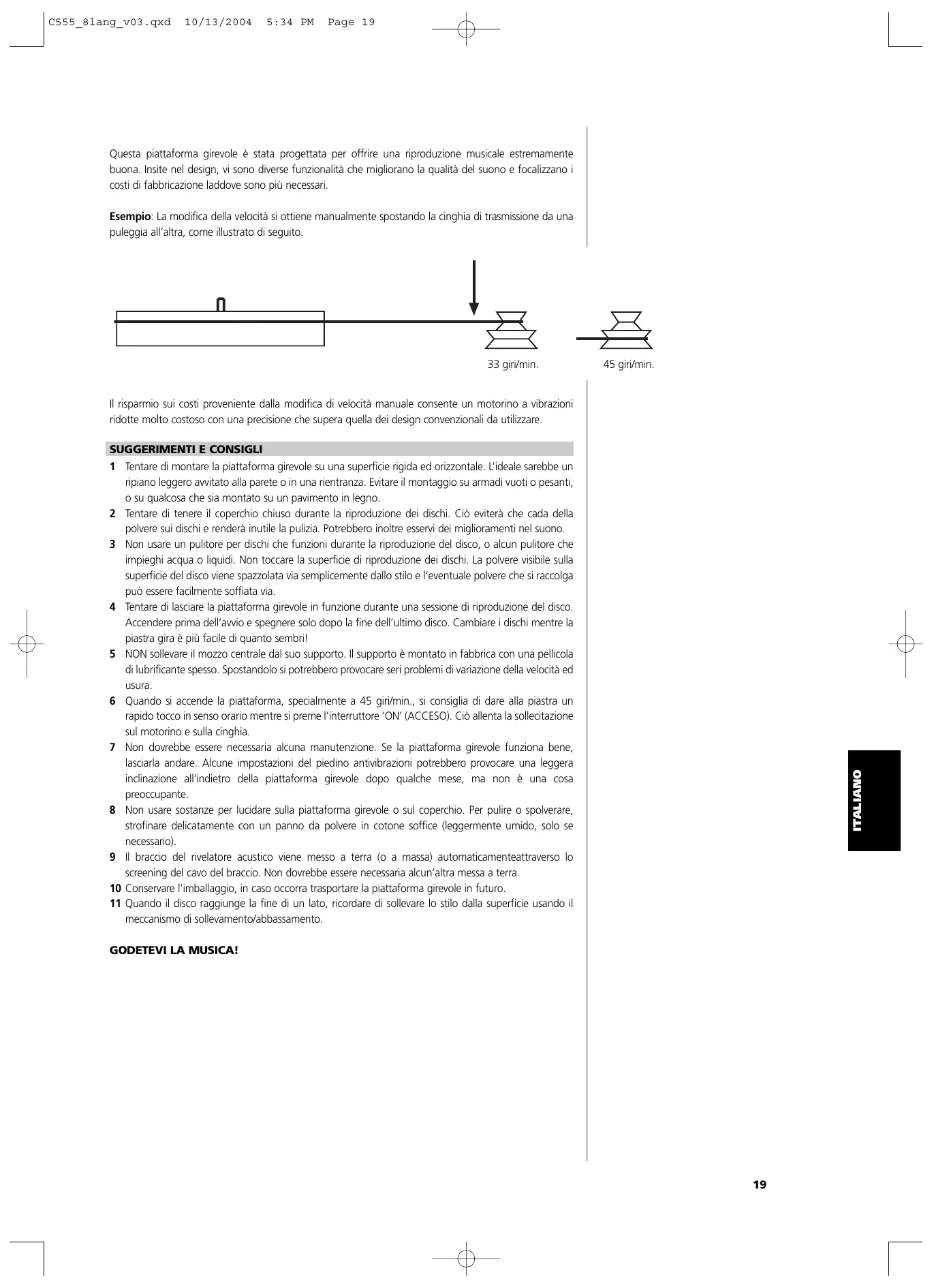 2 Dans la mesure du possible, le couvercle doit rester fermé pendant la lecture des disques. Cette précaution empêche la poussière de se déposer sur les disques et rend leur nettoyage inutile. Elle permet aussi d’améliorer la reproduction du son. 3 N’utilisez pas d’appareil qui nettoie les disques pendant la lecture, ni de dispositif de nettoyage qui fonctionne avec de l’eau ou un liquide quelconque. Ne touchez pas la surface de lecture des disques. Toute poussière visible à la surface du disque est simplement balayée par la pointe; en cas d’accumulation de poussières au niveau de la pointe, il suffit de la dégager en soufflant dessus. 4 Dans la mesure du possible, laissez tourner le plateau en permanence pendant une séance d’écoute de disques. Mettez l’appareil en marche avant de commencer et ne l’éteignez pas avant la fin du dernier disque. Changer un disque alors que le plateau tourne, ce n’est pas aussi facile que l’on puisse le penser ! 5 NE SOULEVEZ PAS le moyeu central de son palier. Le palier a été assemblé chez le fabricant avec une couche de lubrifiant épais. Si vous dérangez cet assemblage, cela peut entraîner de graves problèmes d’usure et d’oscillations de vitesse. 6 Lorsque vous mettez la platine tourne-disques en marche, surtout à 45 tr/mn, il est recommandé de lancer manuellement le plateau dans le sens des aiguilles d’une montre au moment où vous appuyez sur le bouton “MARCHE”. En procédant ainsi, vous diminuerez les contraintes sur le moteur et la courroie. 7 Aucune maintenance n’est normalement nécessaire. Si la platine tourne-disques fonctionne correctement, ne touchez à rien. Après quelques mois, il se pourrait que les pieds antivibratoires se tassent un peu, faisant pencher la platine légèrement en arrière, mais cela ne doit susciter aucune inquiétude. 8 N’utilisez aucun produit pour nettoyer la platine ou son couvercle. Pour éliminer la poussière, essuyez doucement avec un chiffon doux (légèrement humecté si c’est vraiment nécessaire). 9 Le bras de lecture est automatiquement relié à la terre (ou à la masse) via le blindage du câble du bras. Aucune autre mise à la terre ne devrait être nécessaire. 10 Conservez les emballages, pour le cas où vous auriez besoin de transporter la platine tourne-disques à nouveau. 11 Lorsque vous avez fini d’écouter une face d’un disque, n’oubliez pas de relever la pointe de la surface du disque en vous servant du lève-bras. IL NE VOUS RESTE PLUS QU’À PROFITER DE LA MUSIQUE !