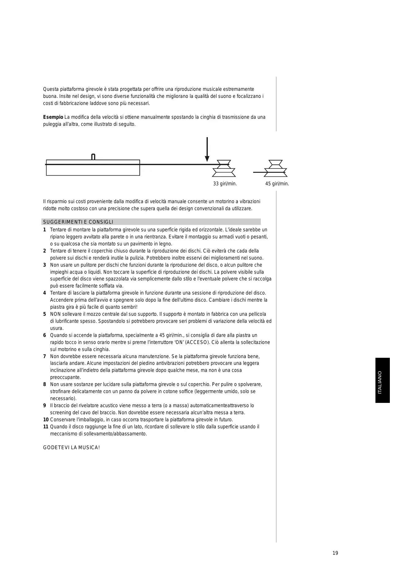 2 Dans la mesure du possible, le couvercle doit rester fermé pendant la lecture des disques. Cette précaution empêche la poussière de se déposer sur les disques et rend leur nettoyage inutile. Elle permet aussi d’améliorer la reproduction du son. 3 N’utilisez pas d’appareil qui nettoie les disques pendant la lecture, ni de dispositif de nettoyage qui fonctionne avec de l’eau ou un liquide quelconque. Ne touchez pas la surface de lecture des disques. Toute poussière visible à la surface du disque est simplement balayée par la pointe; en cas d’accumulation de poussières au niveau de la pointe, il suffit de la dégager en soufflant dessus. 4 Dans la mesure du possible, laissez tourner le plateau en permanence pendant une séance d’écoute de disques. Mettez l’appareil en marche avant de commencer et ne l’éteignez pas avant la fin du dernier disque. Changer un disque alors que le plateau tourne, ce n’est pas aussi facile que l’on puisse le penser ! 5 NE SOULEVEZ PAS l moyeu e central de son palier. Le palier a été assemblé chez le fabricant avec une couche de lubrifiant épais. Si vous dérangez cet assemblage, cela peut entraîner de graves problèmes d’usure et d’oscillations de vitesse. 6 Lorsque vous mettez la platine tourne-disques en marche, surtout à 45 tr/mn, il est recommandé de lancer manuellement le plateau dans le sens des aiguilles d’une montre au moment où vous appuyez sur le bouton “MARCHE”. En procédant ainsi, vous diminuerez les contraintes sur le moteur et la courroie. 7 Aucune maintenance n’est normalement nécessaire. Si la platine tourne-disques fonctionne correctement, ne touchez à rien. Après quelques mois, il se pourrait que les pieds antivibratoires se tassent un peu, faisant pencher la platine légèrement en arrière, mais cela ne doit susciter aucune inquiétude. 8 N’utilisez aucun produit pour nettoyer la platine ou son couvercle. Pour éliminer la poussière, essuyez doucement avec un chiffon doux (légèrement humecté si c’est vraiment nécessaire). 9 Le bras de lecture est automatiquement relié à la terre (ou à la masse) via le blindage du câble du bras. Aucune autre mise à la terre ne devrait être nécessaire. 10 Conservez les emballages, pour le cas où vous auriez besoin de transporter la platine tourne-disques à nouveau. 11 Lorsque vous avez fini d’écouter une face d’un disque, n’oubliez pas de relever la pointe de la surface du disque en vous servant du lève-bras. IL NE VOUS RESTE PLUS QU’À PROFITER DE LA MUSIQUE !