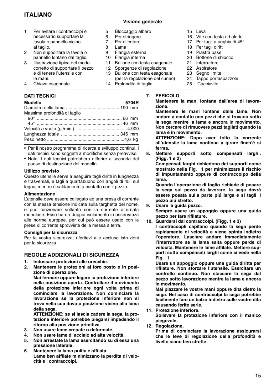 - Bloccaggio albero Per stringere Per allentare Lama Flangia esterna Flangia interna Bullone con testa esagonale Sporgenze di regolazione Bullone con testa esagonale (per la regolazione del cuneo) 14 Profondità di taglio DATI TECNICI Modello 5704R Diametro della lama p. 190