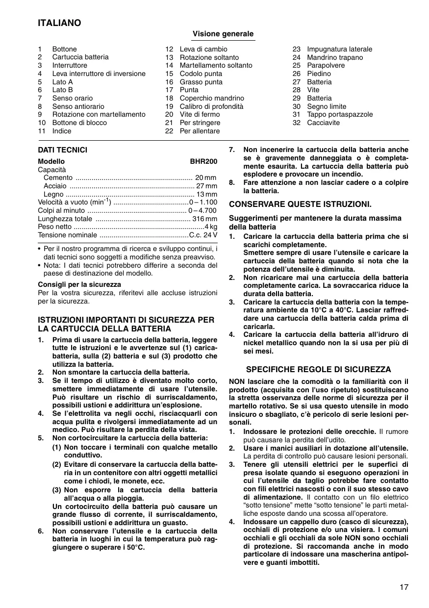 Quando si usa l'utensile al di sopra della testa, accertarsi sempre che la cartuccia batteria sia fissata saldamente in modo che non cada fuori. Se dovesse cadere fuori dall'utensile, potrebbe causare lesioni all'opera-tore o a chi gli sta vicino.