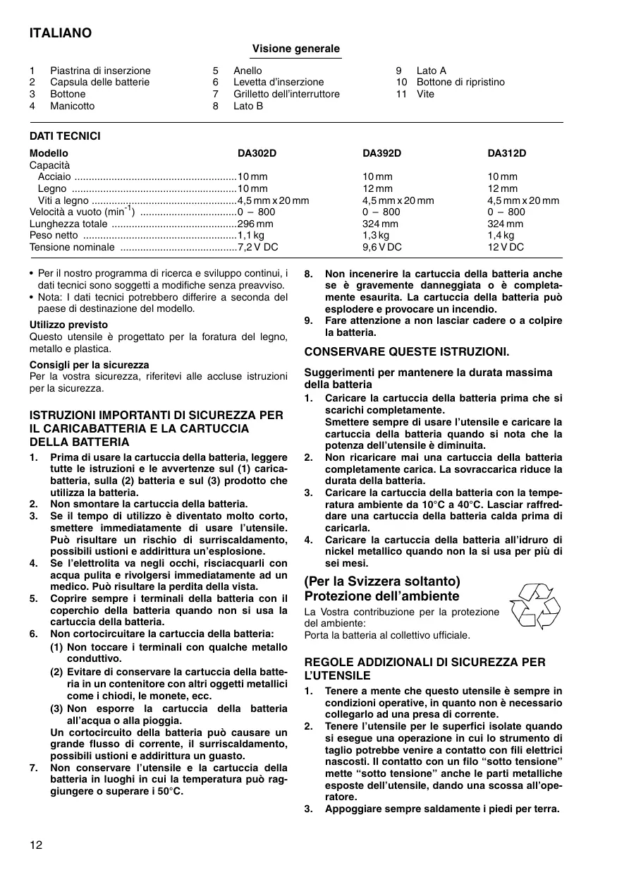 10 mm 12 mm 4,5 mm x 20 mm 0 – 800 324 mm 1,4 kg 12 V DC Non incenerire la cartuccia della batteria anche se è gravemente danneggiata o è completamente esaurita. La cartuccia della batteria può esplodere e provocare un incendio. Fare attenzione a non lasciar cadere o a colpire la batteria. Caricare la cartuccia della batteria prima che si scarichi completamente. Smettere sempre di usare l’utensile e caricare la cartuccia della batteria quando si nota che la potenza dell’utensile è diminuita. Non ricaricare mai una cartuccia della batteria completamente carica. La sovraccarica riduce la durata della batteria. Caricare la cartuccia della batteria con la temperatura ambiente da 10°C a 40°C. Lasciar raffreddare una cartuccia della batteria calda prima di caricarla. Caricare la cartuccia della batteria all’idruro di nickel metallico quando non la si usa per più di sei mesi. (Per la Svizzera soltanto) Protezione dell’ambiente La Vostra contribuzione per la protezione del ambiente: Porta la batteria al collettivo ufficiale.