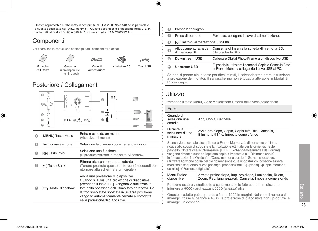 Manuslee Garanzia Cavo di Adattatore CC CavoUSB Upstream USB ï dellutente {non disponible alimentazione o in Frame Memory collegando il cavo USB al PC. in tutti paesi) Se non si preme alcun tasto per dieci minuti, il salvaschermo entra in funzione a protezione del monitor. Il salvaschermo non à tuttavia attivabile in Modalità : : Proiez diapo Posteriore / Collegamenti (œ &a Utilizzo l Ê 4 ° ia Premendo il tasto Menu, viene visualizzato il menu della voce selezionata. vf al" E Fe F ÿ | oto = | U . cf 13 E ° 0 + Quando si e à eus 0.4. 0® © fi En ) sohziona une | Ari Copie, Cancall o Ô L RE Durante la i Awvia pro diapo, Copia, Copia tutti file, Cancella, Entra o esce da un menu. selezione di una | Elimina tutt i file, Imposta come sfondo © [MENU] Tasto Menu (iualizza il menu) miniatura me
